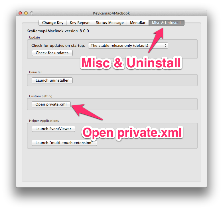 KeyRemap4MacBookをインストールしたら設定を開いて「Misc & Uninstall」タブの「Custom Setting」の「Open private.xml」をクリックする。