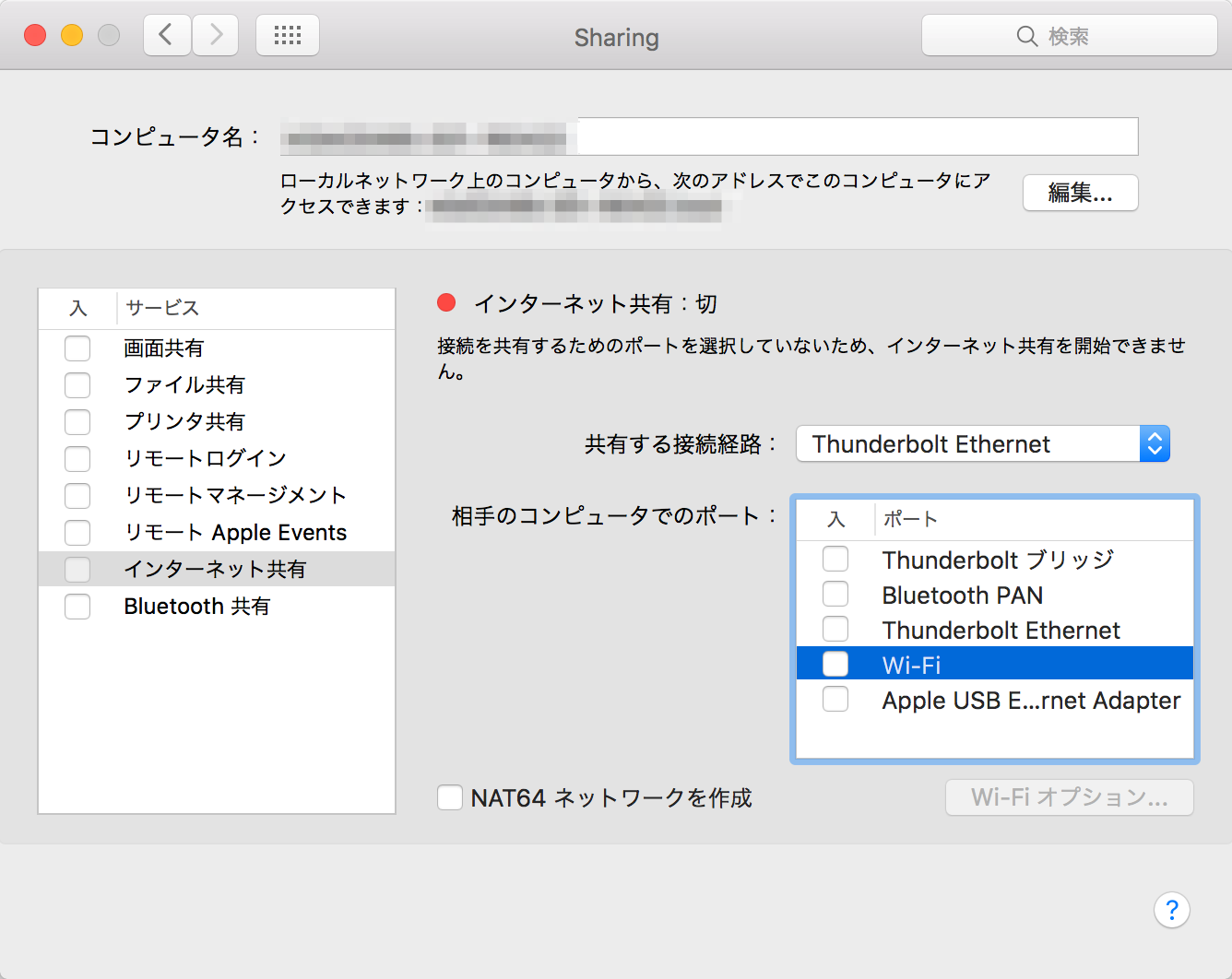 - 「共有する接続経路」は、LANをつかっているので「Thunderbolt Ethernet」を選択しました