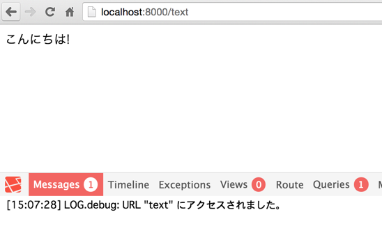 http://localhost:8000/text にアクセスしてみます。 こんにちは!と表示されればOKです。