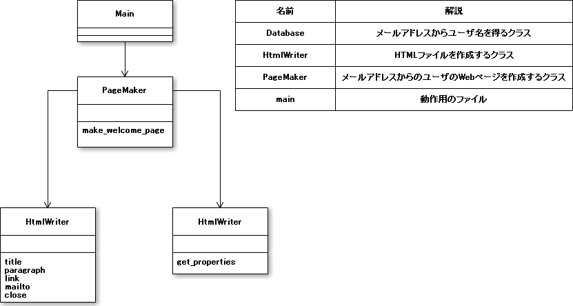 PageMakerクラスは、DatabaseクラスとHtmlWriterクラスを組み合わせて、指定したユーザのWebページを作成するためのものです。