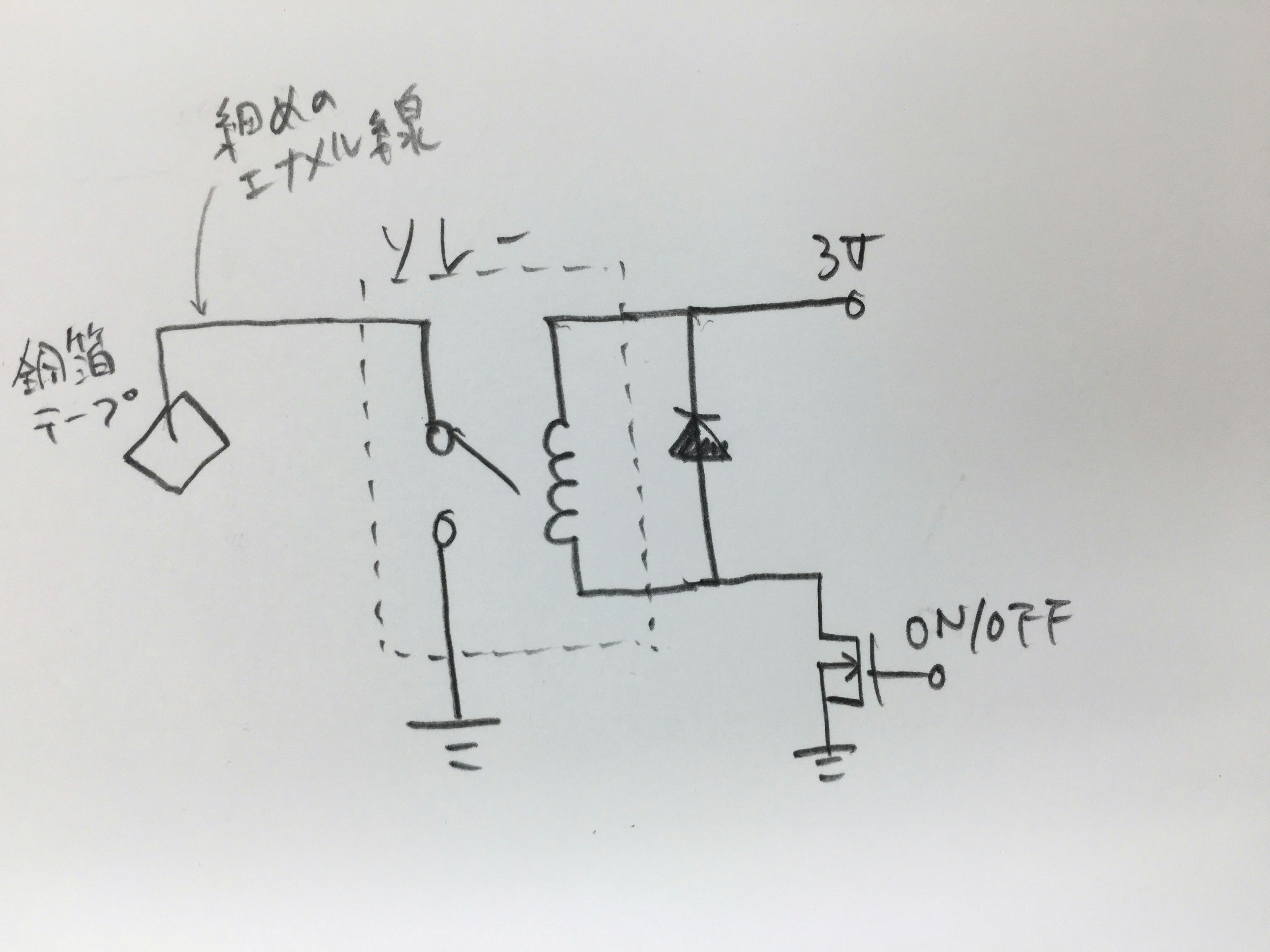 注意点は銅箔テープは小さめに、銅箔テープからリレーの入り口までは細めのエナメルで短く配線します。そうしないとGNDに落とさなくても銅箔テープと導線だけで静電容量を変化させてしまいタッチ状態と認識させてしまうからです。