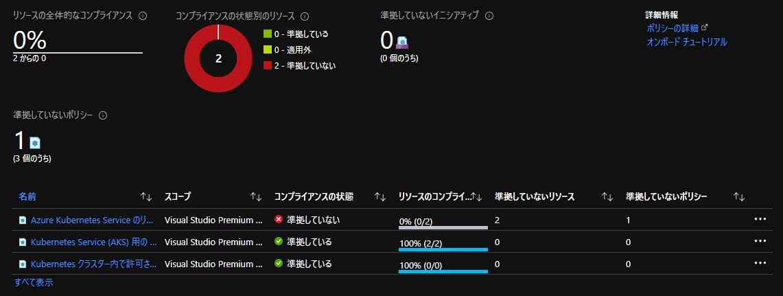 しばらく後、Azure Portal でポリシーの準拠状態を確認すると、1. のポリシー以外は準拠できている状態が確認できます。