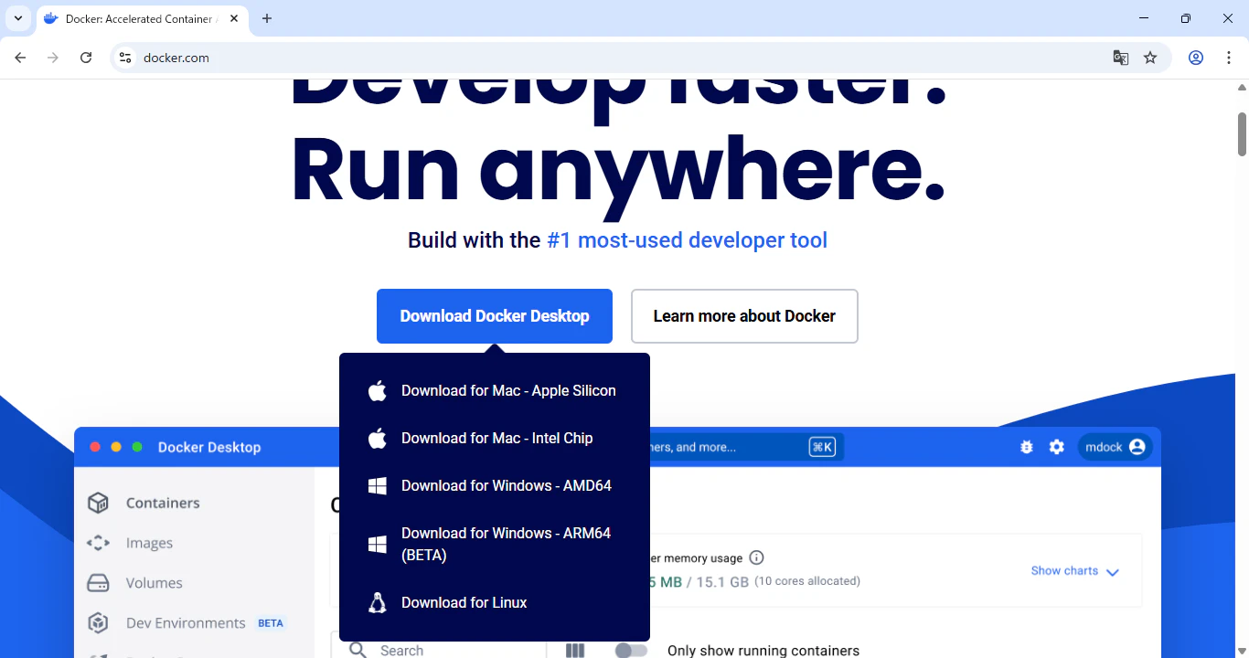 はじめに、以下のURLからDockerの公式サイトにアクセスして、Docker Desktopのインストーラをダウンロードしましょう。