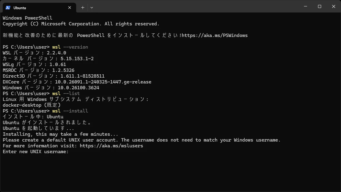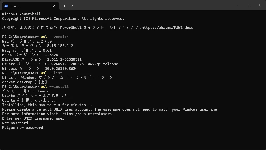 Docker Desktopのセットアップが完了したら、次にWSLのセットアップをしましょう。