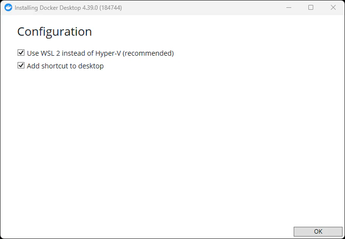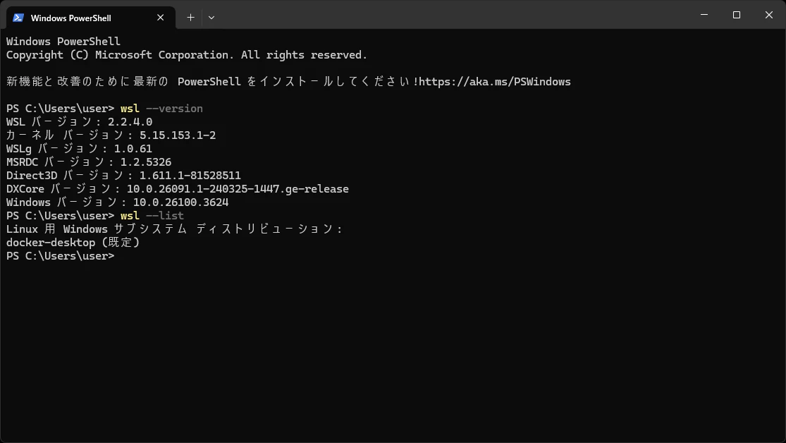 Docker Desktopをセットアップする際に、WSLもインストールされるため、WSLのバージョンが表示されるはずです。