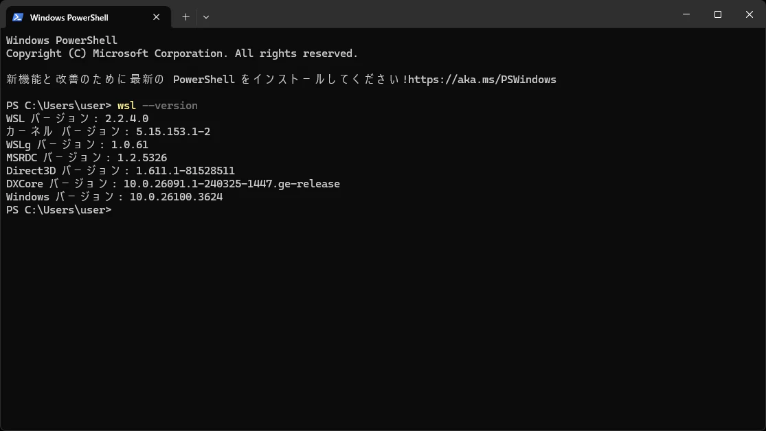 はじめに、Windows PowerShellを起動して、wsl --version コマンドを実行します。