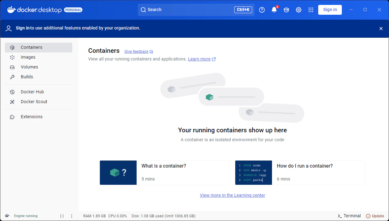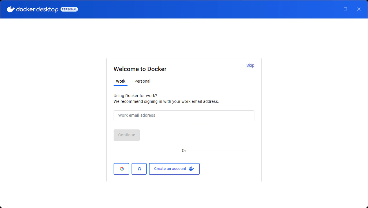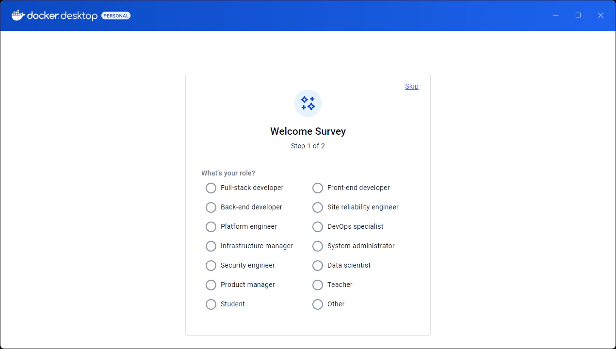ここまでの手順を終了して、次のような画面が表示されたら、Docker Desktopのセットアップは完了です。