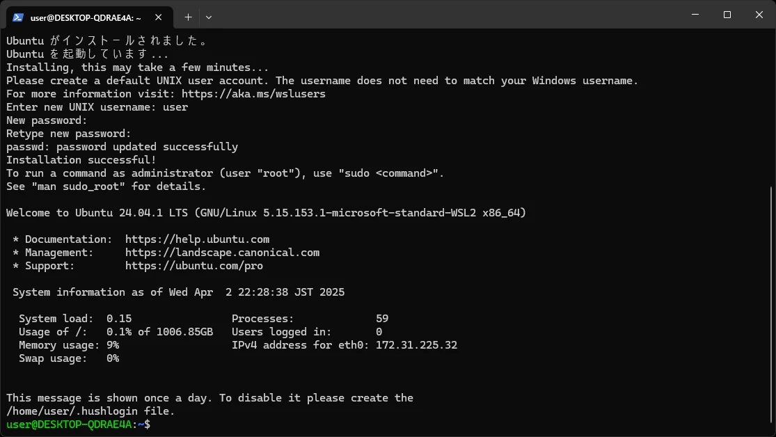 パスワードを入力した後、次のような画面が表示されたら、WSLのセットアップは完了です。