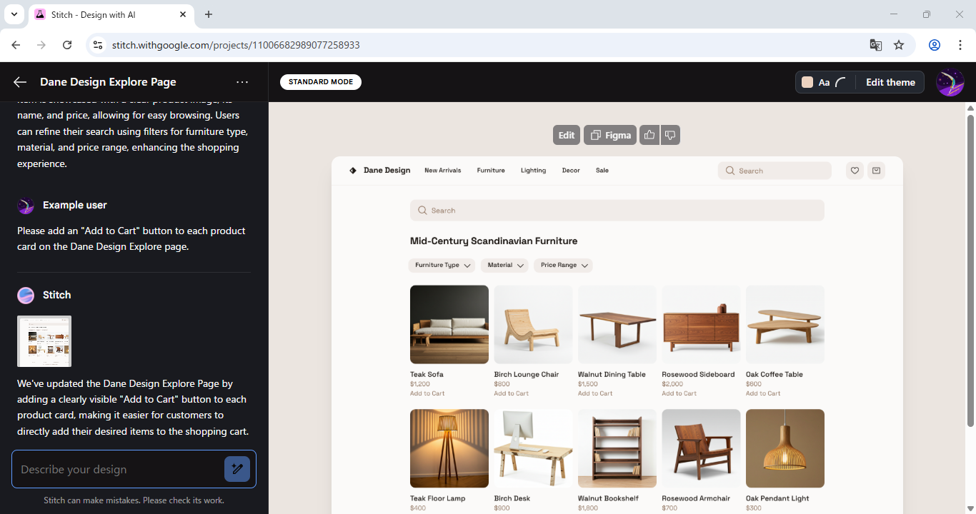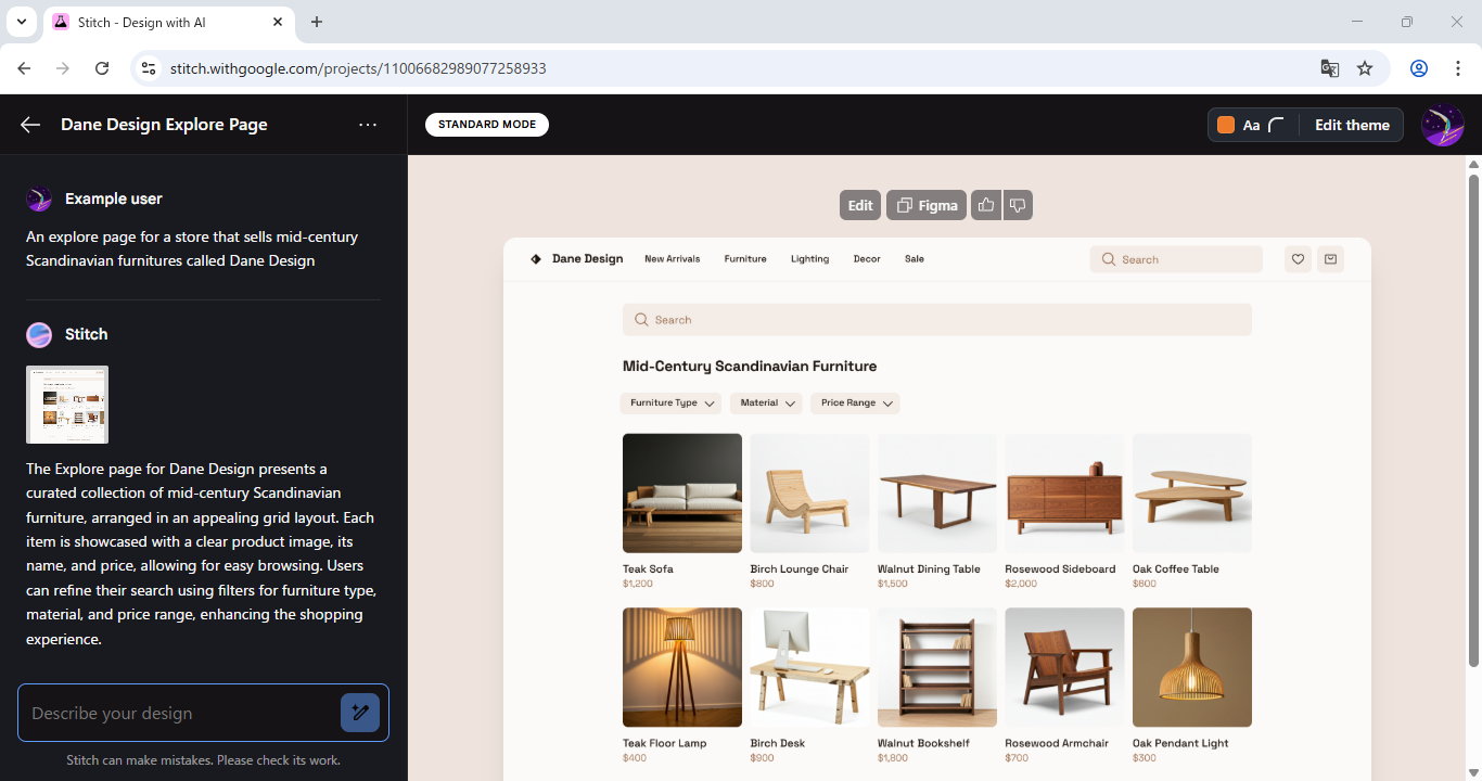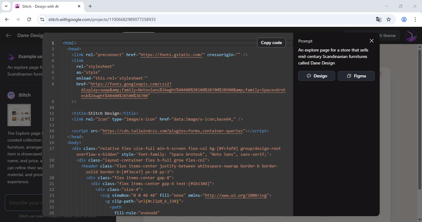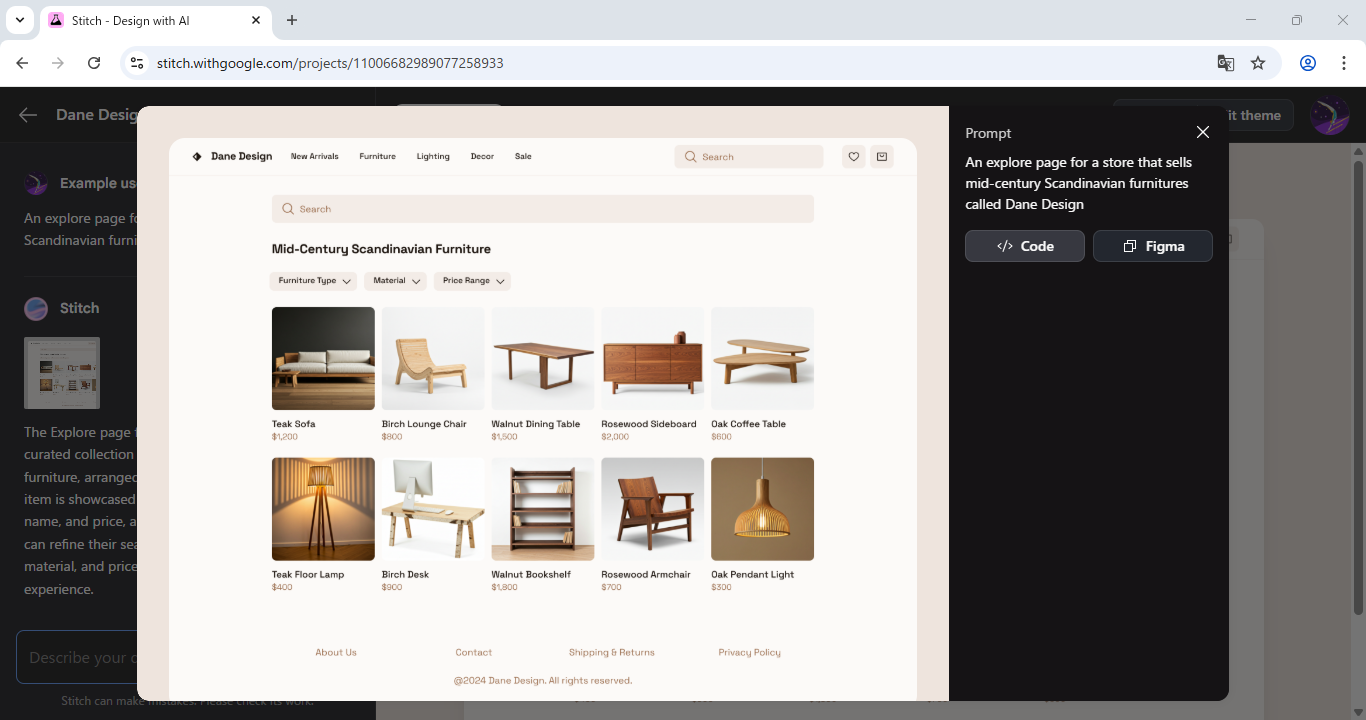 Webアプリ用のデザインを作るので、「Web」を選択し、プロンプトに「An explore page for a store that sells mid-century Scandinavian furnitures called Dane Design」と入力しました。