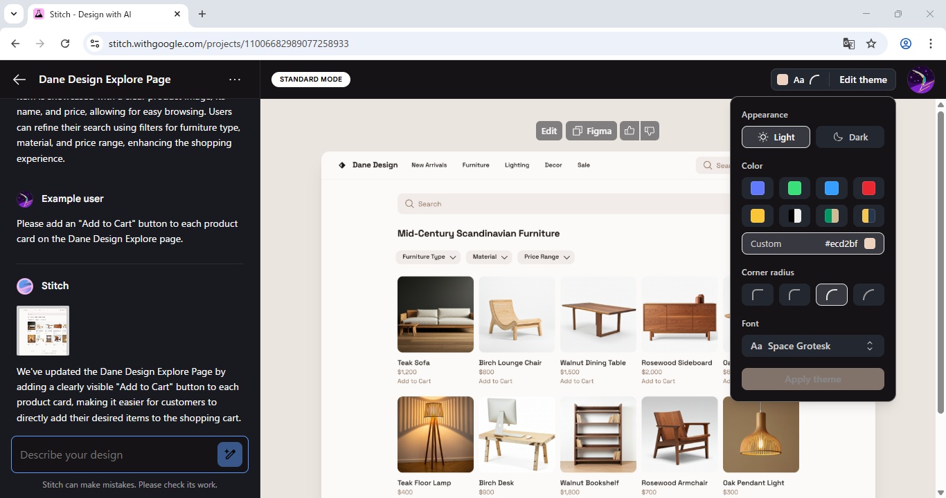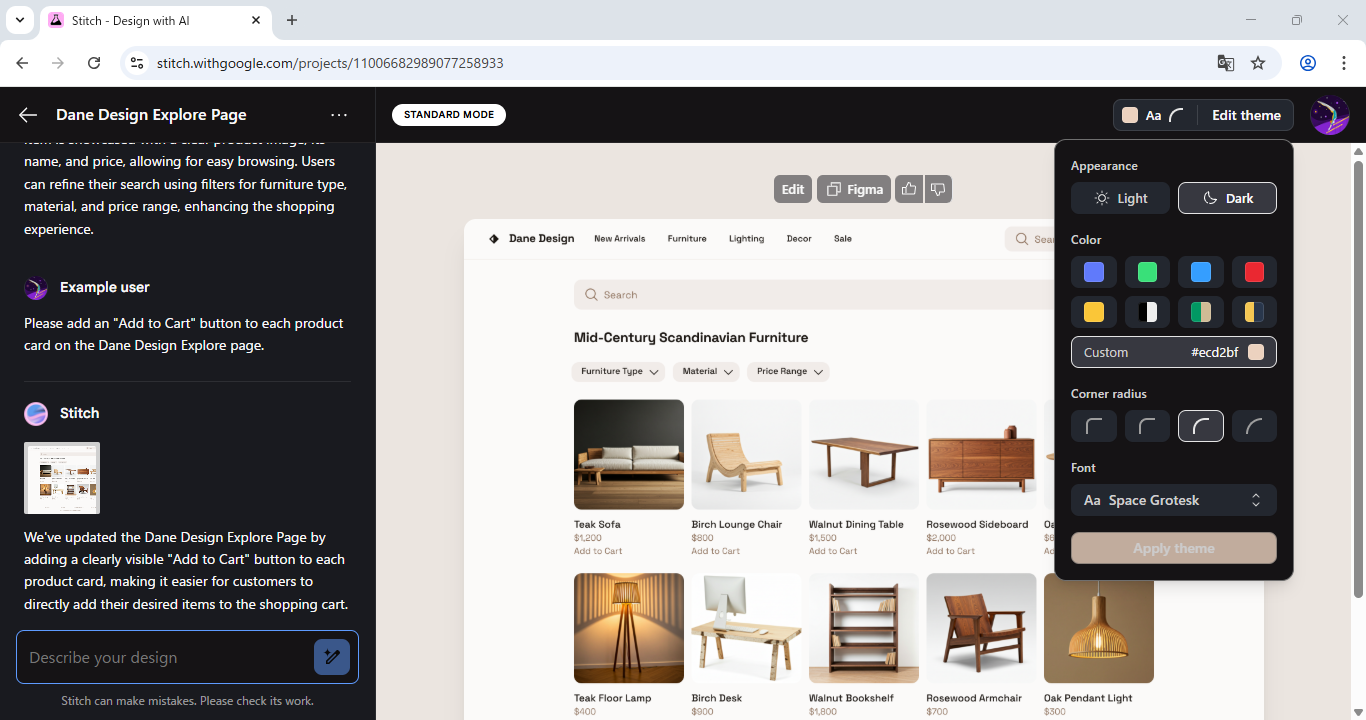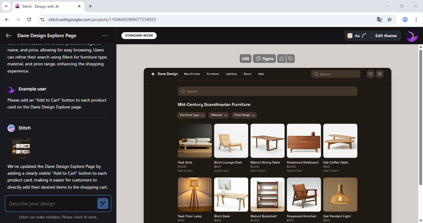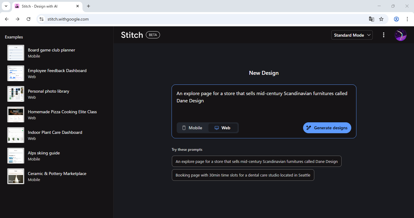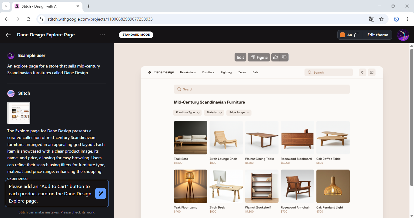 Webアプリ用のデザインを作るので、「Web」を選択し、プロンプトに「An explore page for a store that sells mid-century Scandinavian furnitures called Dane Design」と入力しました。