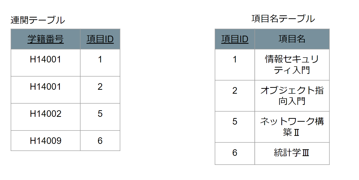 この時に項目テーブルを見ると、複数の学生は複数の項目名テーブルを扱うことがわかります。