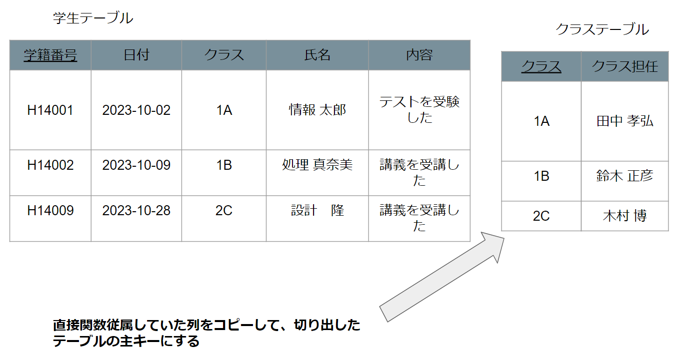 これは主キーの学籍番号に関数従属している列クラスに、さらに関数従属している列クラス担任がある状態(推移的関数従属状態)といえます。