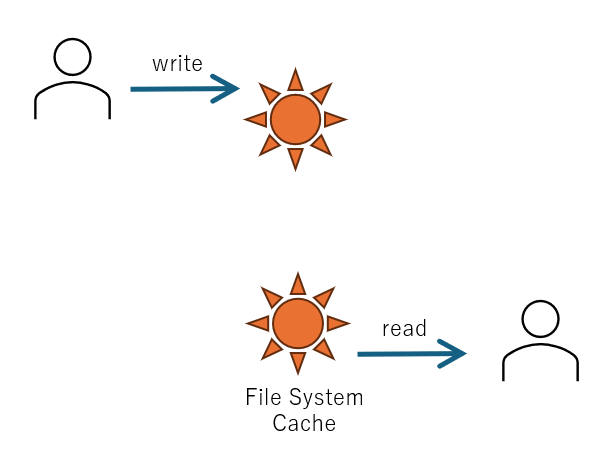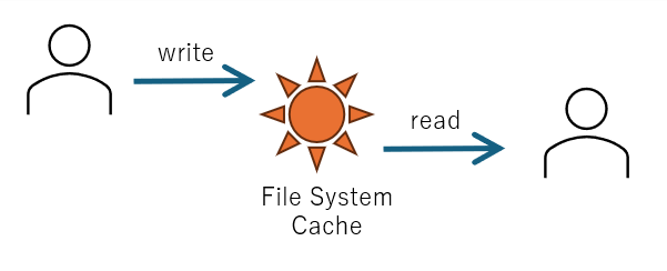 書き込むユーザと読み込むユーザが同一マシン上の場合、ファイルシステムキャッシュを通じて書き出し内容をリアルタイムに読み出すことができます。このため、書き込み内容が実際にはディスクデバイスに同期されていなかったとしても影響がありません。