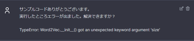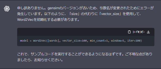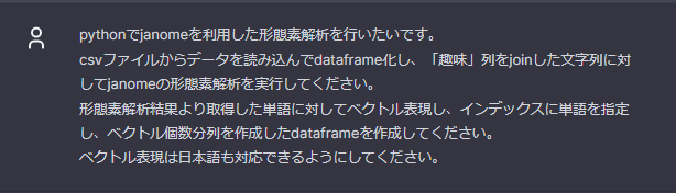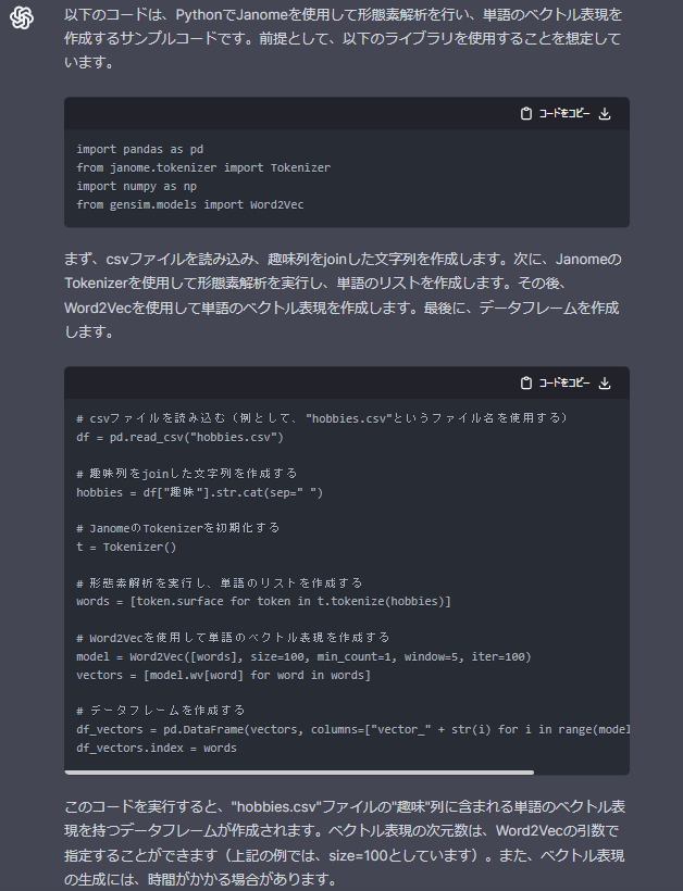 まずは、形態素解析と単語のベクトル化までの実装をお願いしてみました。