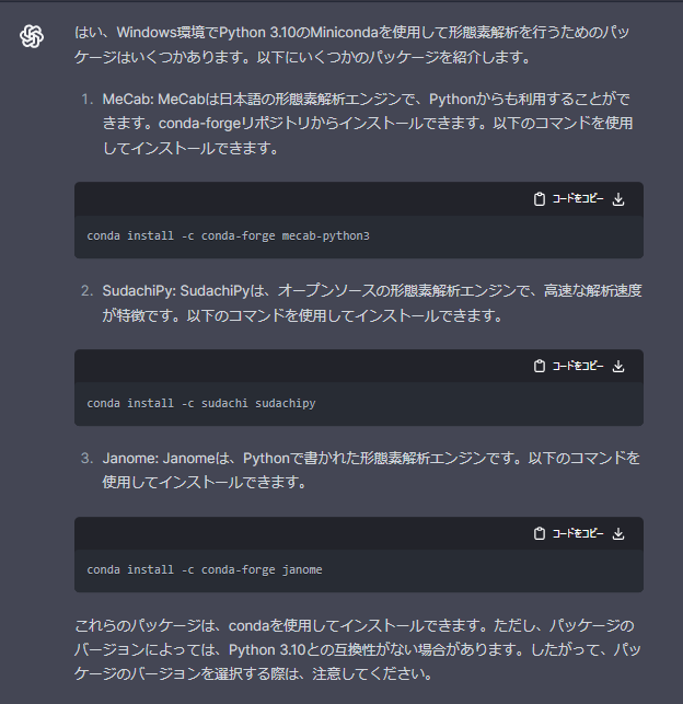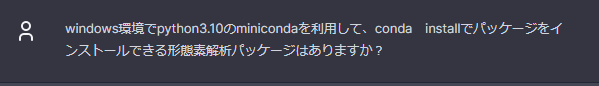今回のテーマの形態素解析で利用するPythonのパッケージについて相談してみました。