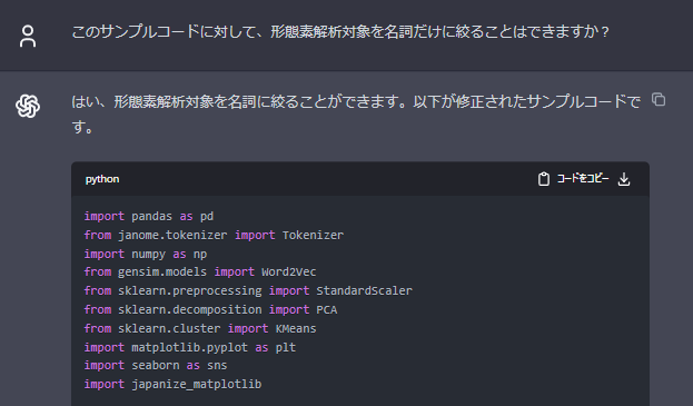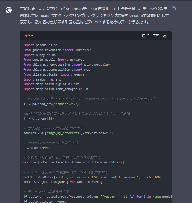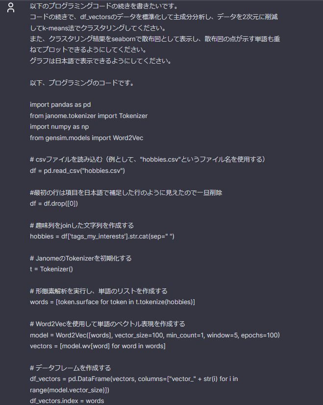 最後に、ベクトル化したデータをクラスタリングし、散布図で描画するところまでChatGPT先生に実装してもらいます。