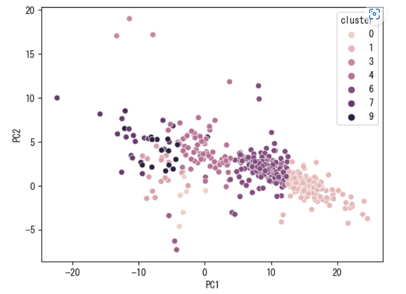 クラスタリング結果を散布図で表示することが出来ました。目標達成です!