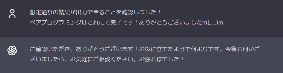 最後にChatGPT先生に感謝を伝えてペアプロ終了です。