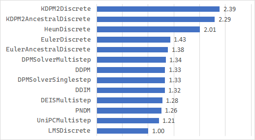 ステップ数 10 を指定したとき LMSDiscreteScheduler を 1 とした所要時間の比率を示します。