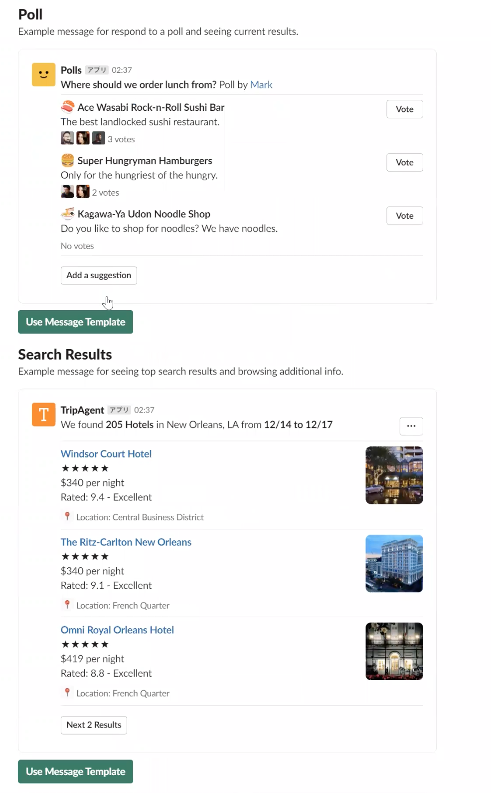 Use Message Templateというボタンを押すとレイアウトのブロックコードをコピーできます。