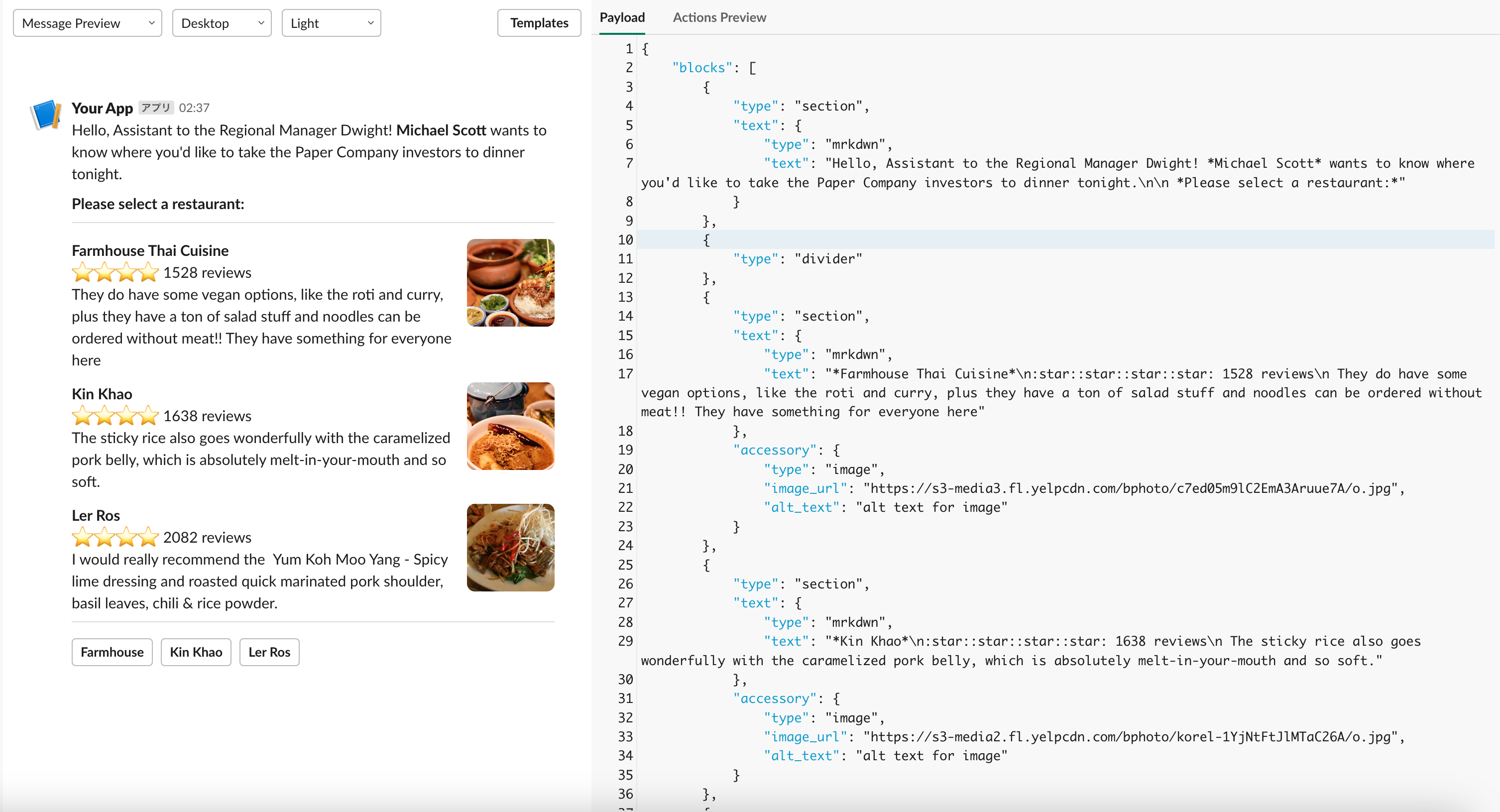 レイアウト周りを直感的に意識しつつ、簡単に構築ができるBlock Kit Builderというツールがあります。