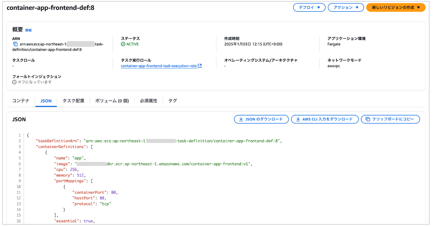 aws ecs describe-task-definition:【CI/CD 全体像】におけるNo.6です。現在のタスク定義を取得します。タスク定義を取得するためのリモートアクションは提供されていないため、AWS CLIを実行しています。 -