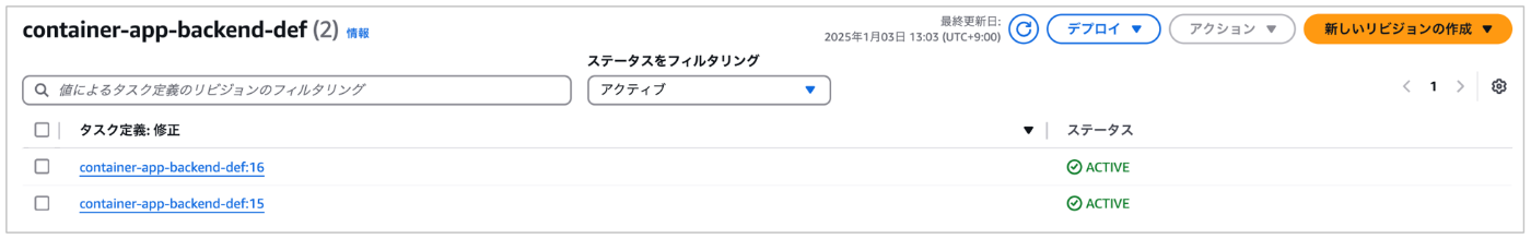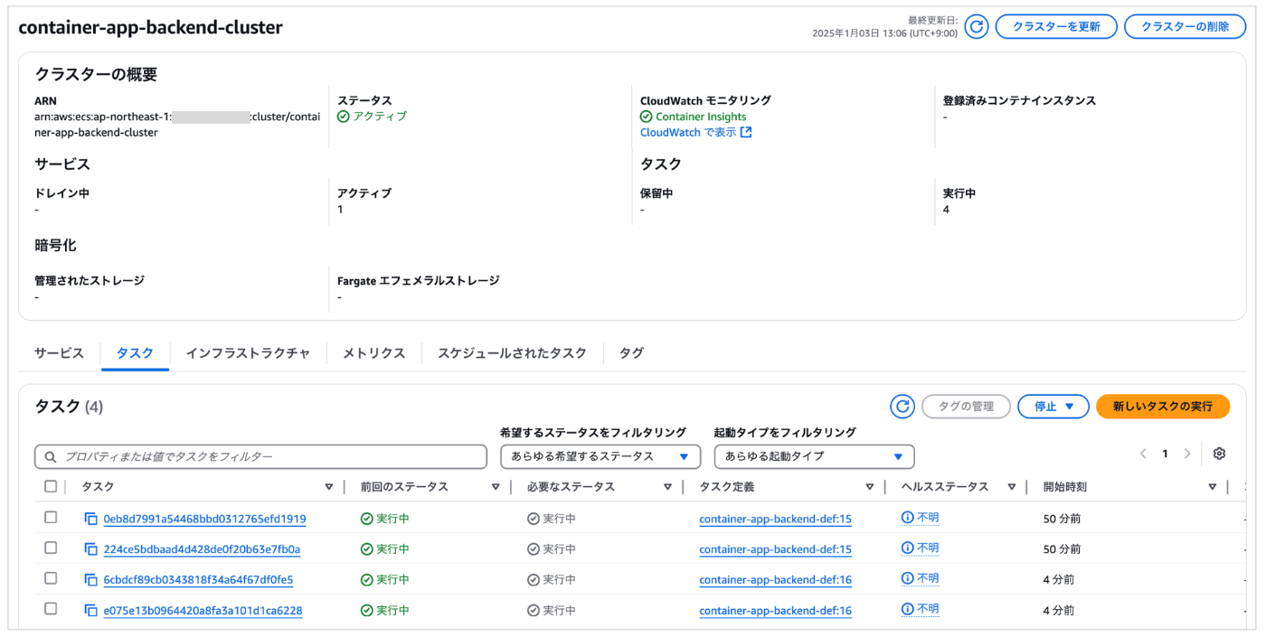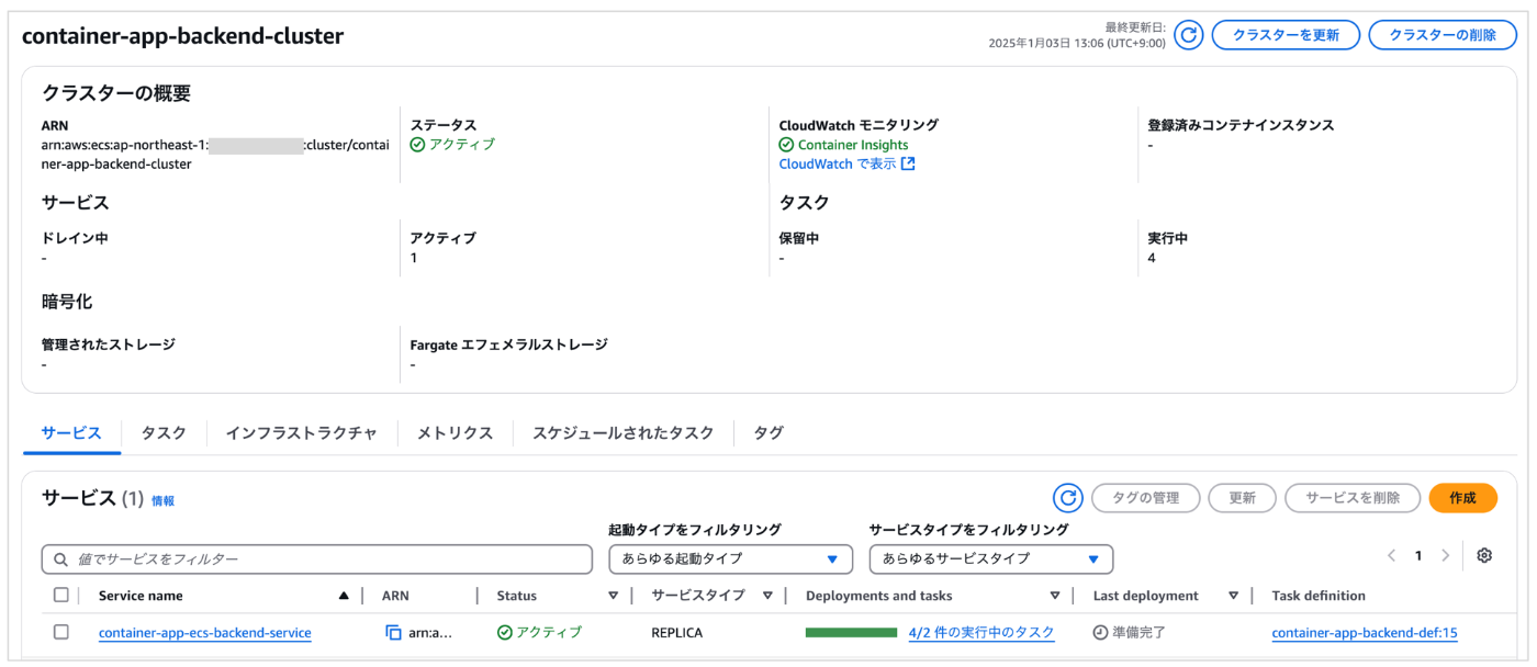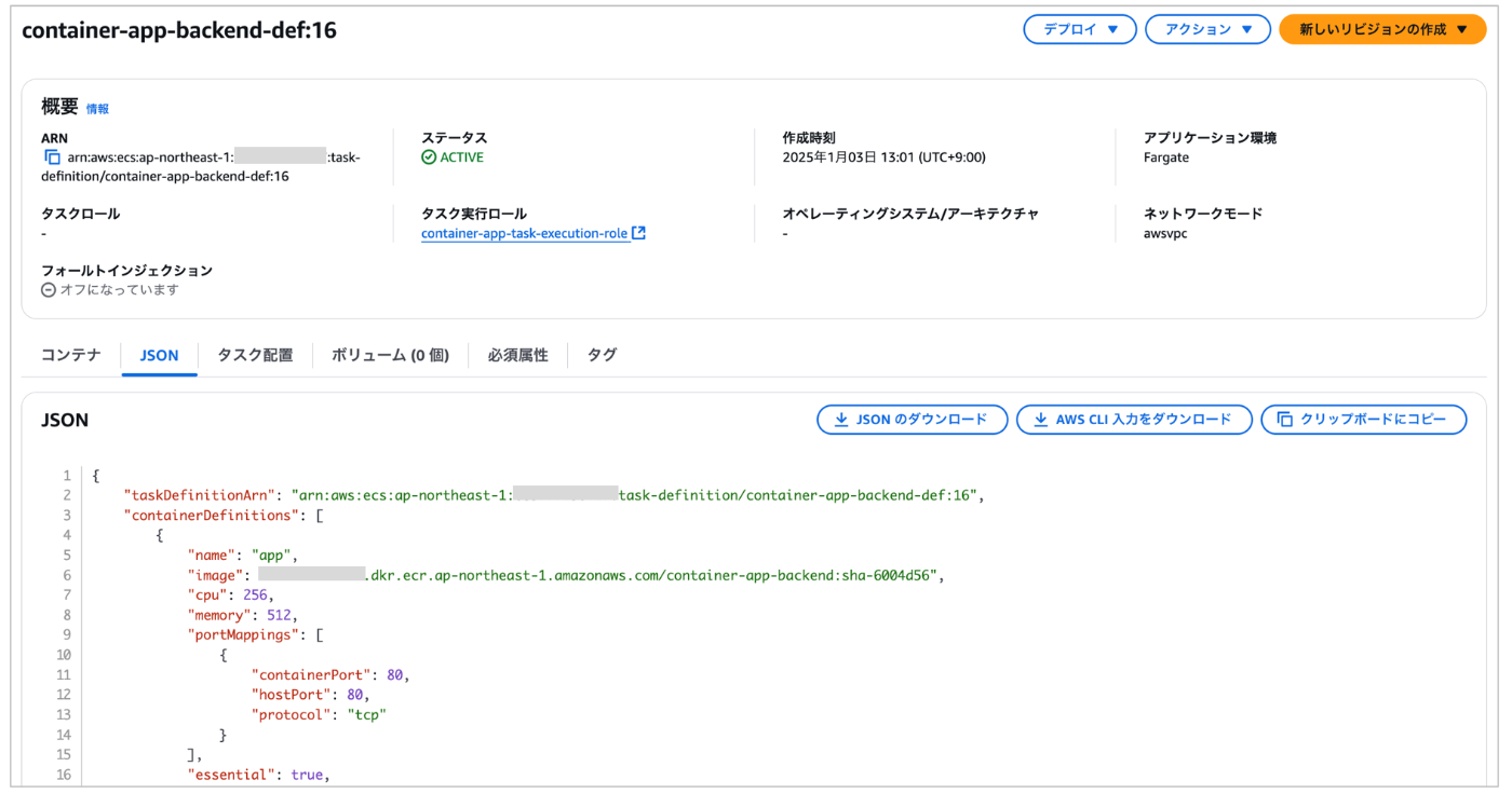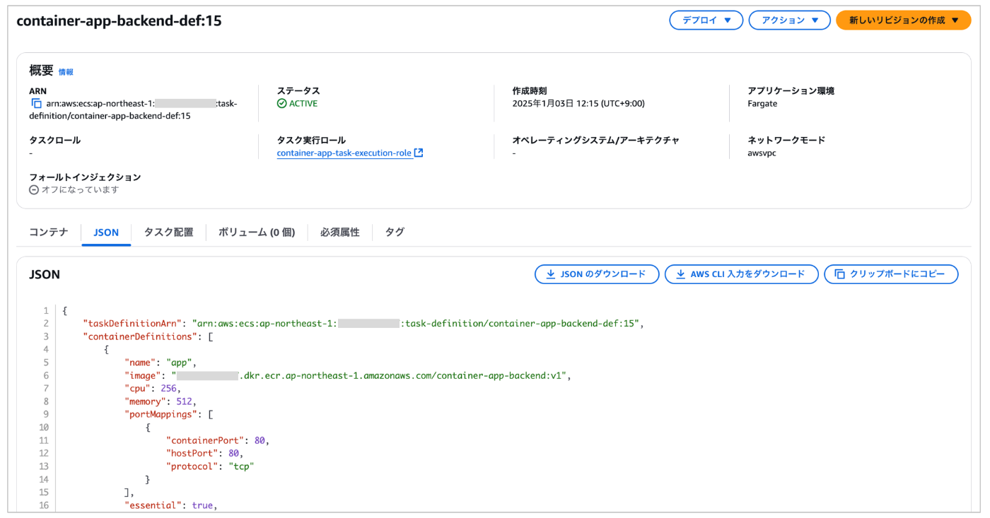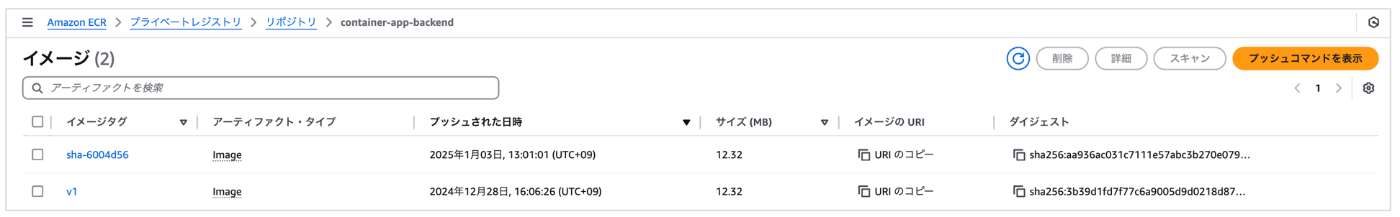 初期構築時点では、管理用EC2で事前に作成したBackend用コンテナイメージ(container-app-backend:v1)を使用してECSタスクを作成しています。
