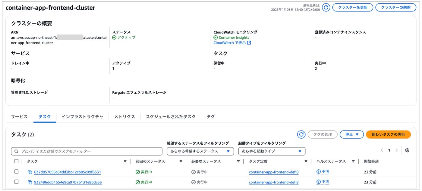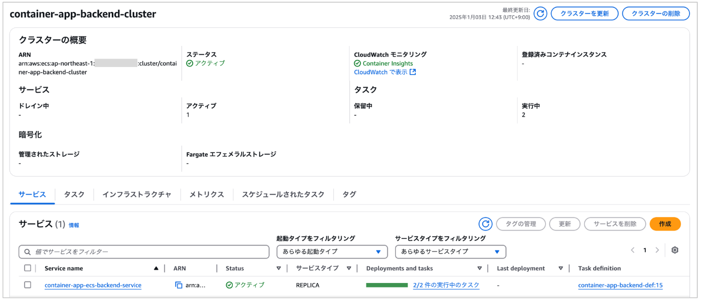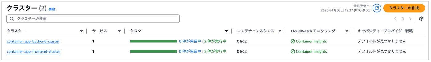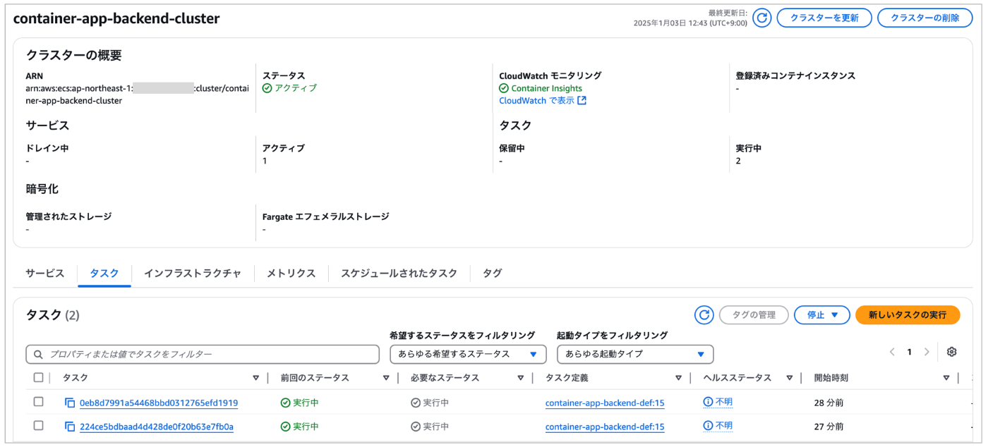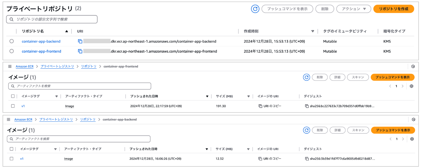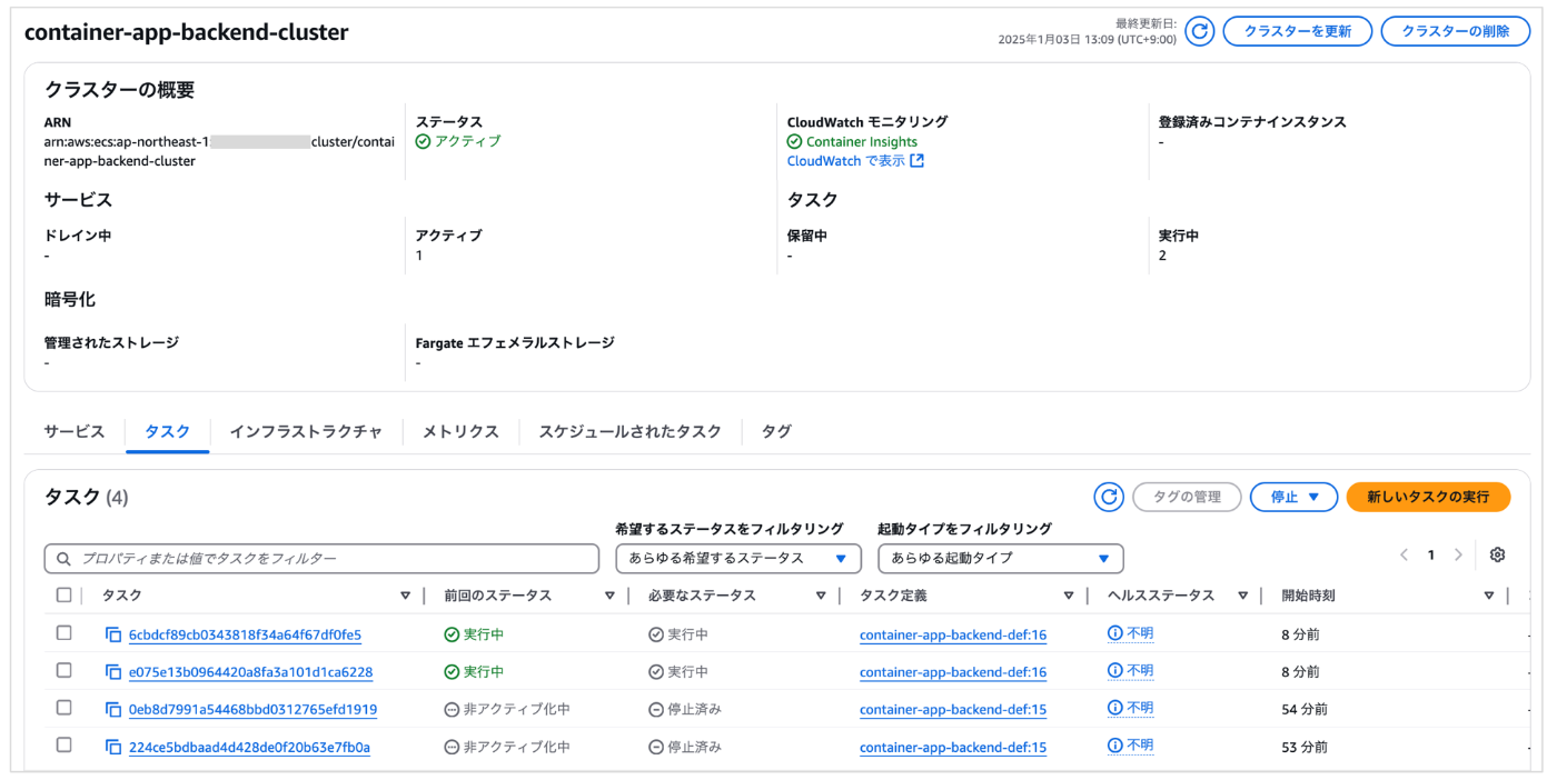 初期構築時点では、管理用EC2で事前に作成したBackend用コンテナイメージ(container-app-backend:v1)を使用してECSタスクを作成しています。