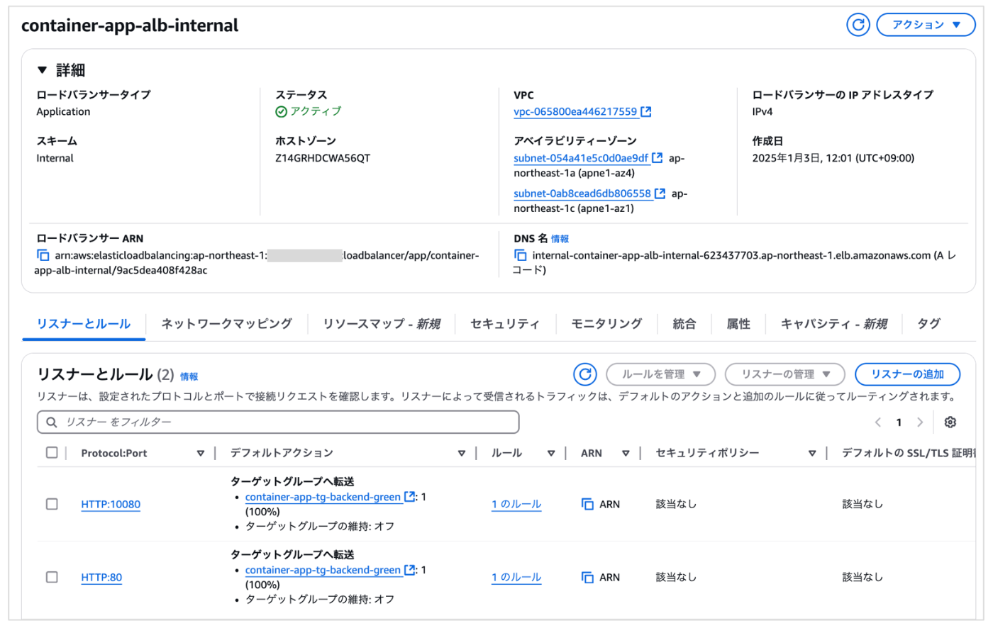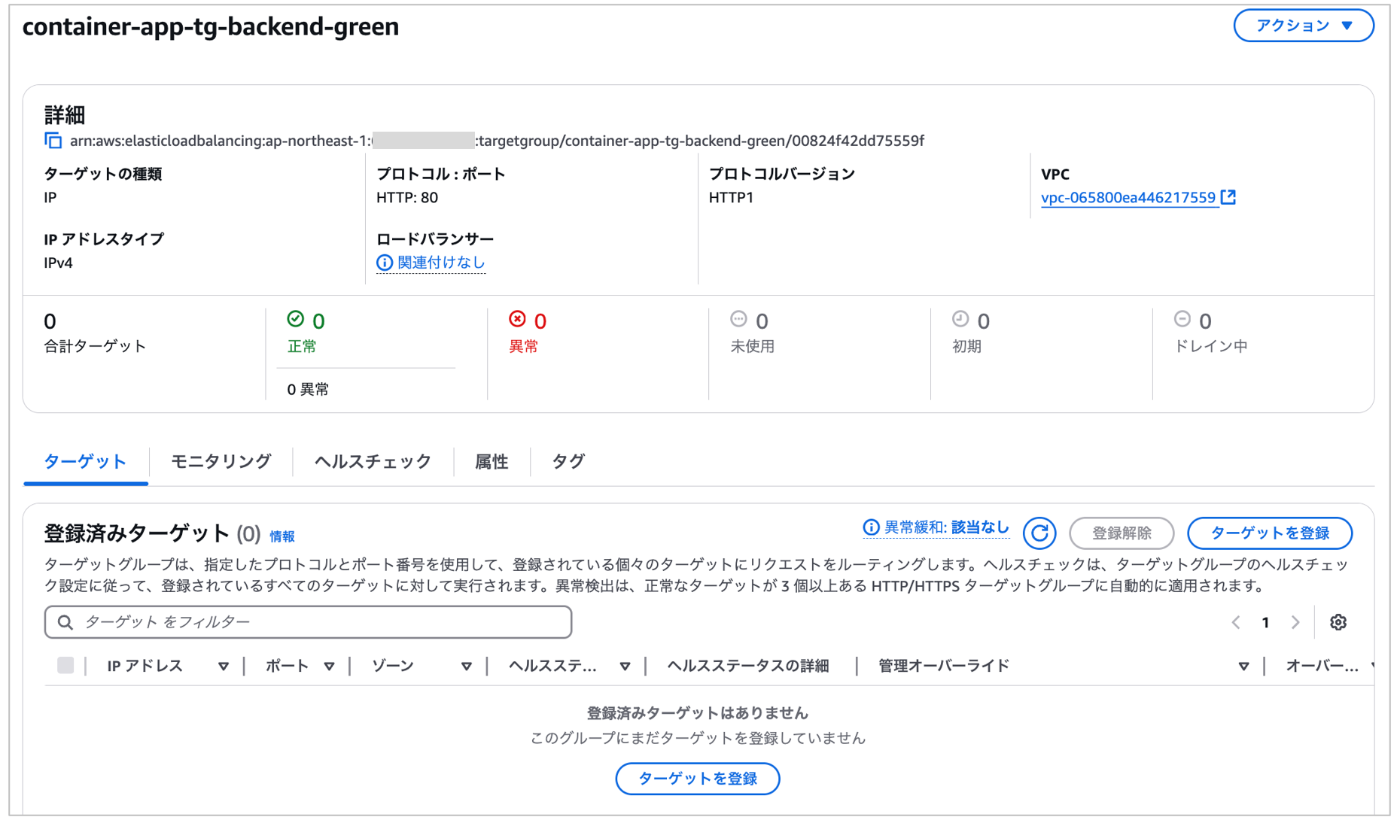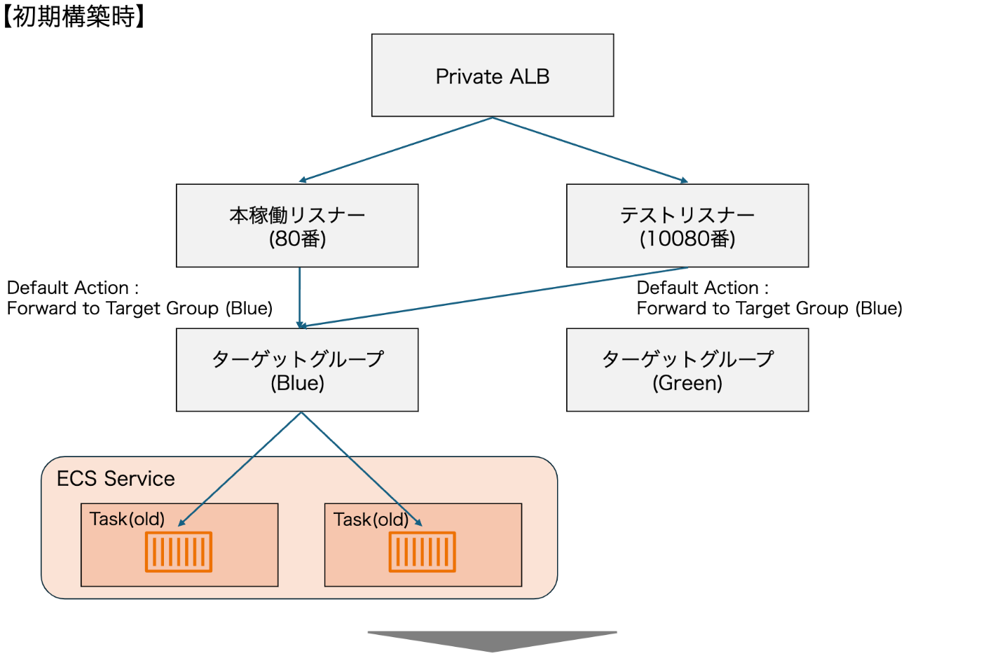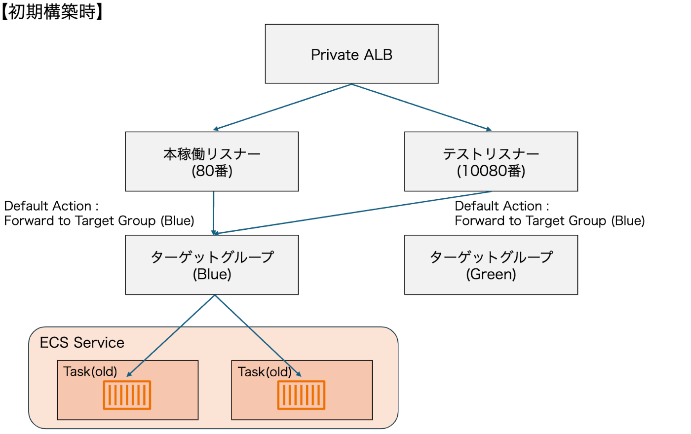 初期構築時点では、本稼働リスナーとテストリスナーの両者において、Blue側のターゲットグループに通信を転送します。Green側のターゲットグループにはリソースは関連付けられていません。