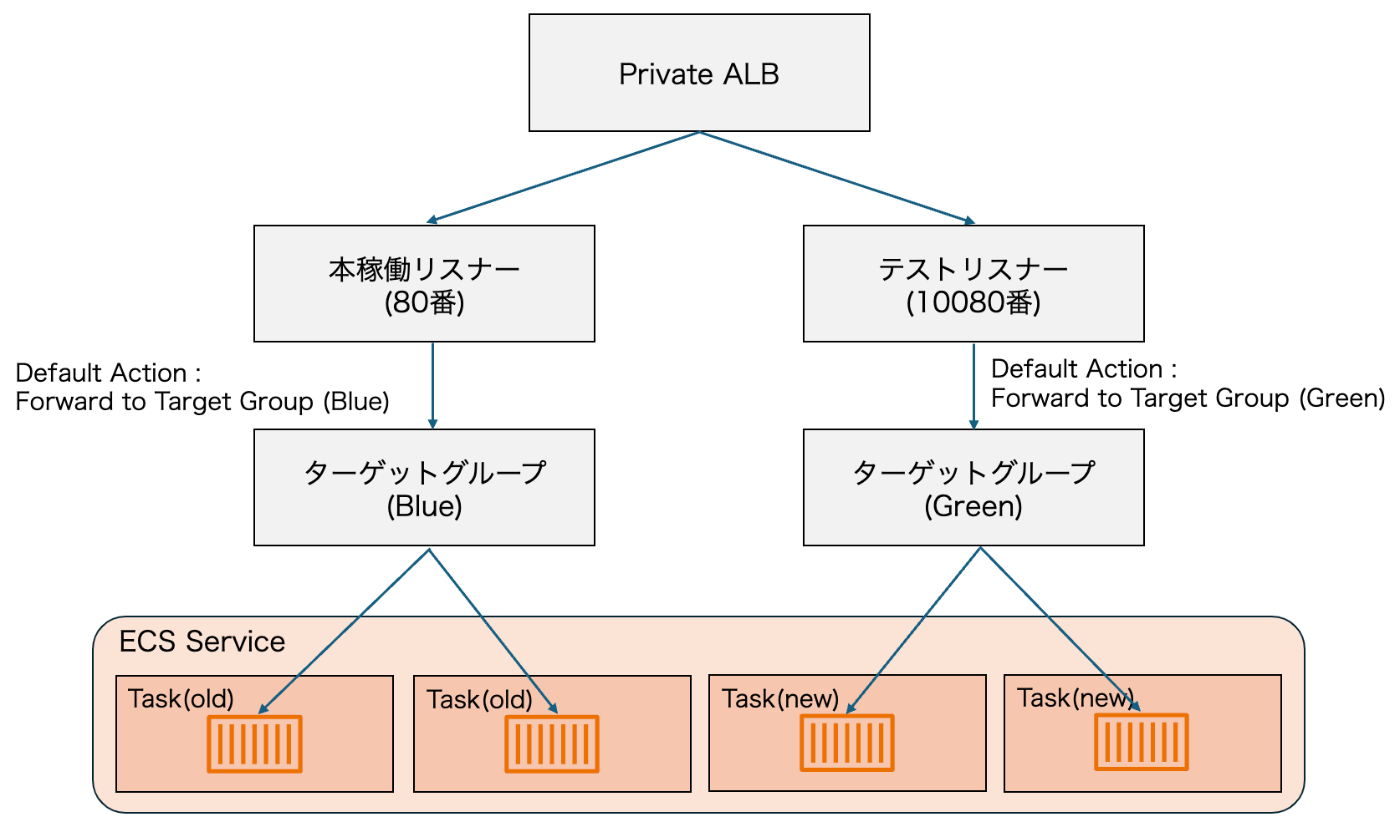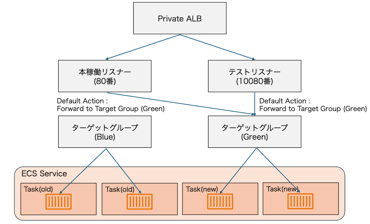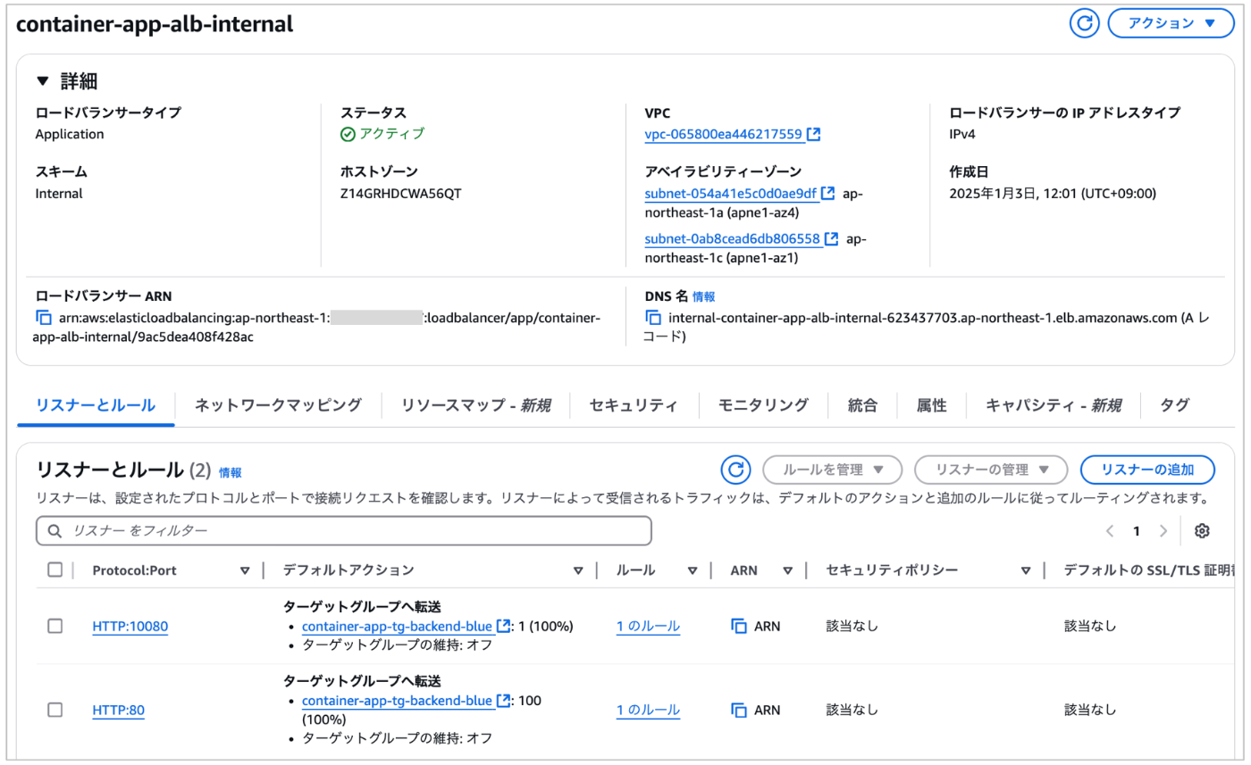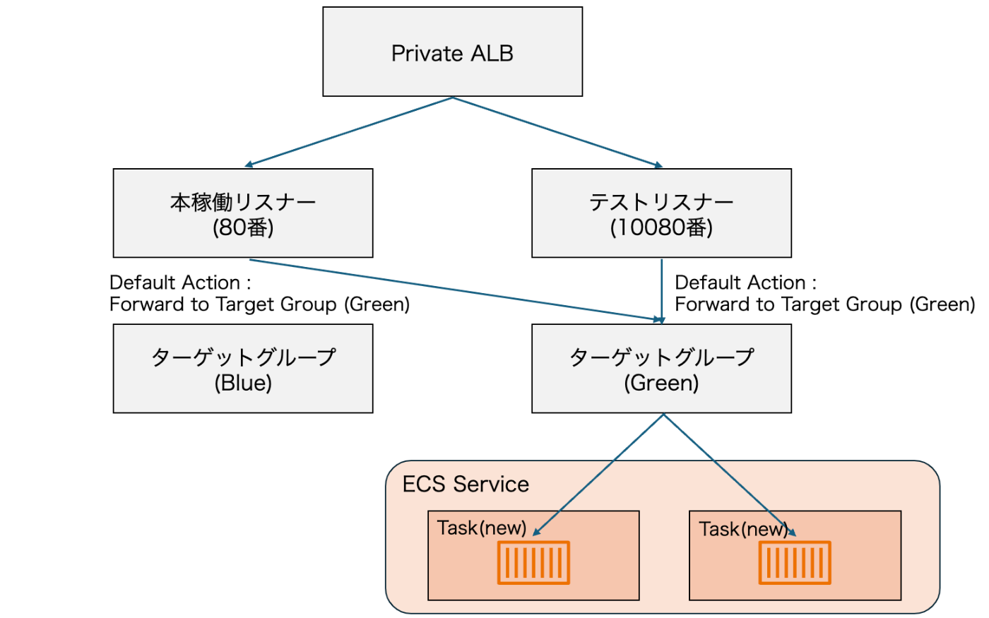 初期構築時点では、本稼働リスナーとテストリスナーの両者において、Blue側のターゲットグループに通信を転送します。Green側のターゲットグループにはリソースは関連付けられていません。