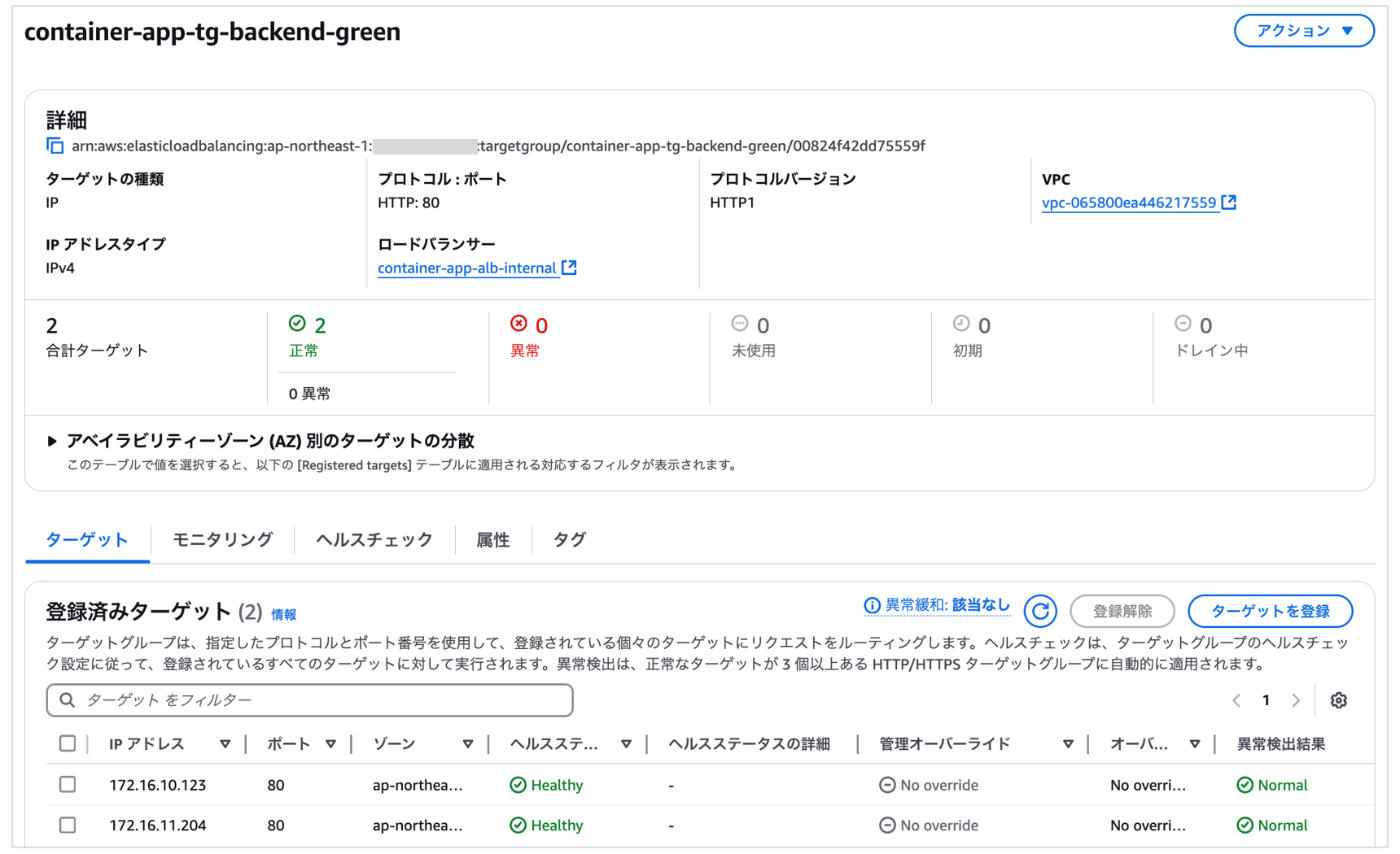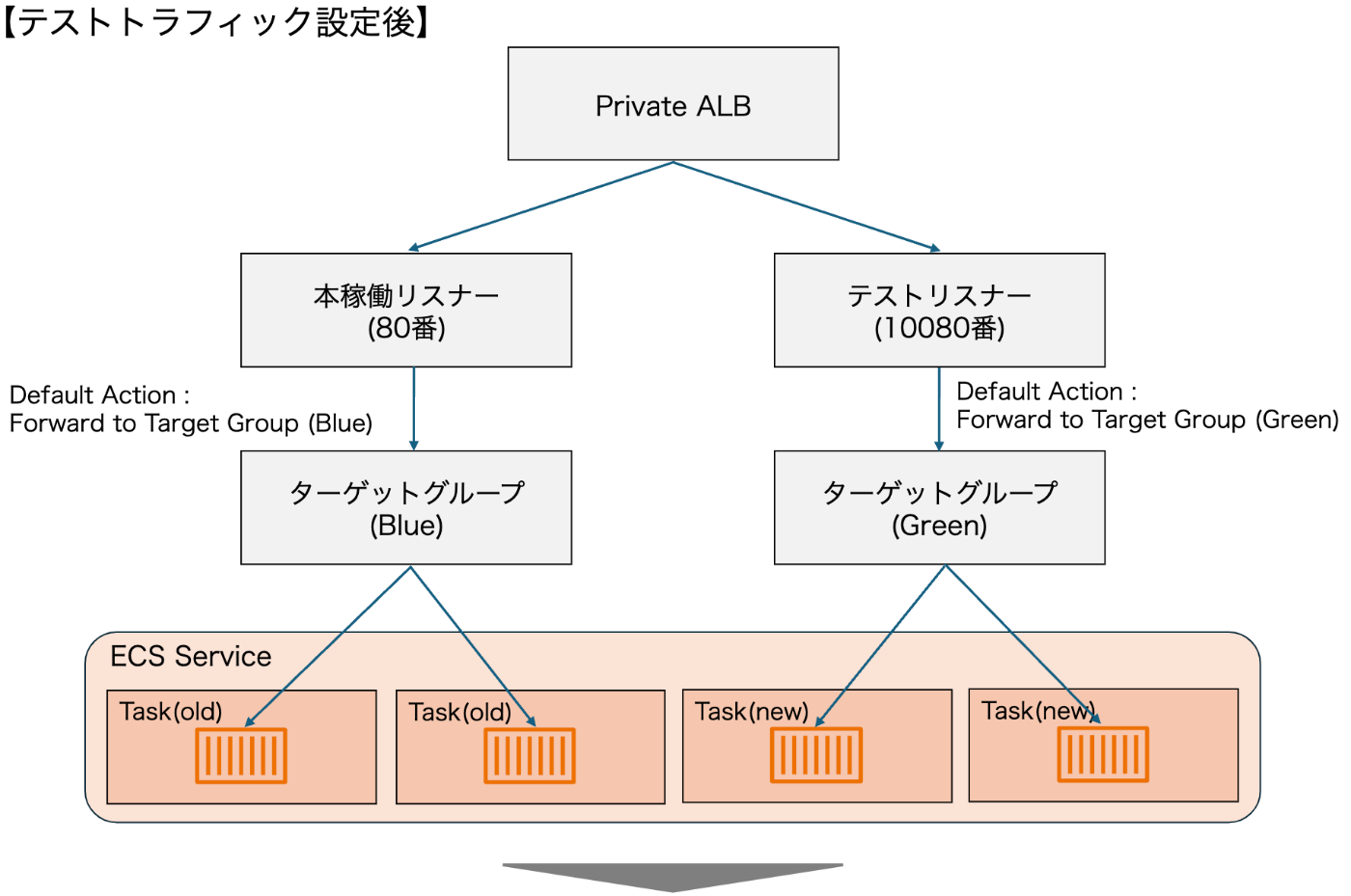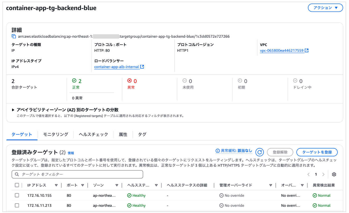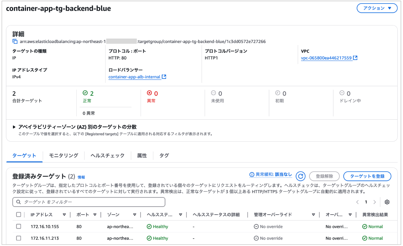 初期構築時点では、本稼働リスナーとテストリスナーの両者において、Blue側のターゲットグループに通信を転送します。Green側のターゲットグループにはリソースは関連付けられていません。