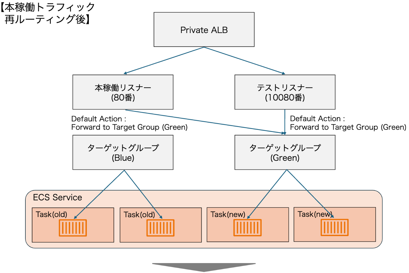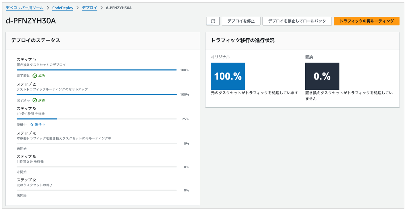 ステップ3において「トラフィックの再ルーティング」を押下すると、本稼働リスナーの転送先がGreen側ターゲットグループに更新されます。ステップ5の段階では、旧ECSタスクは削除されずに残っています。「デプロイを停止してロールバック」を押下することで、本稼働リスナーの転送先をBlue用ターゲットグループへとロールバックすることができます。