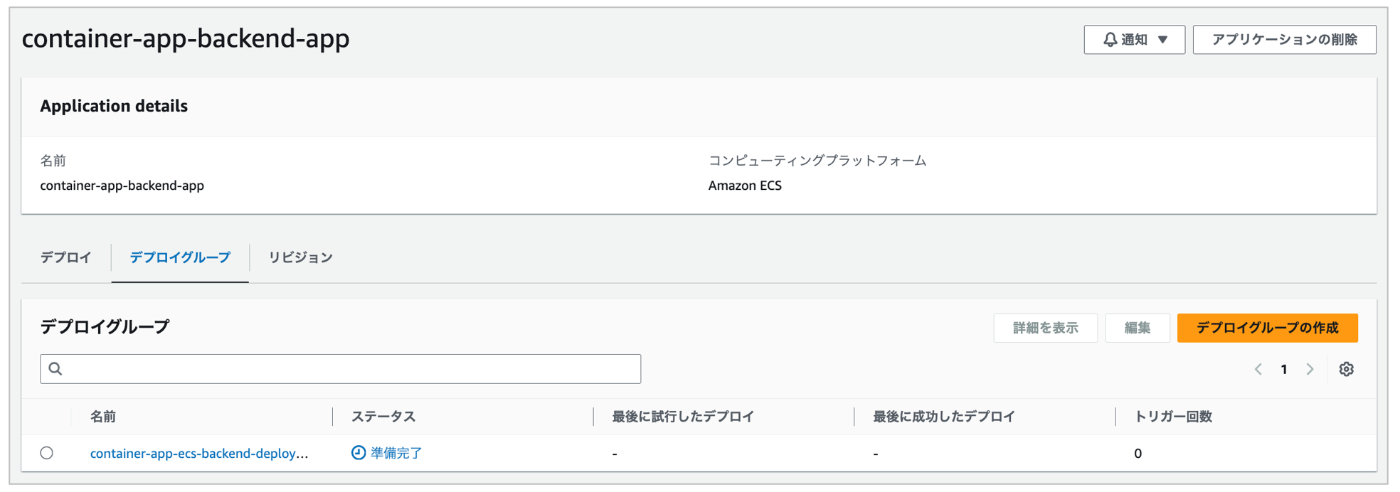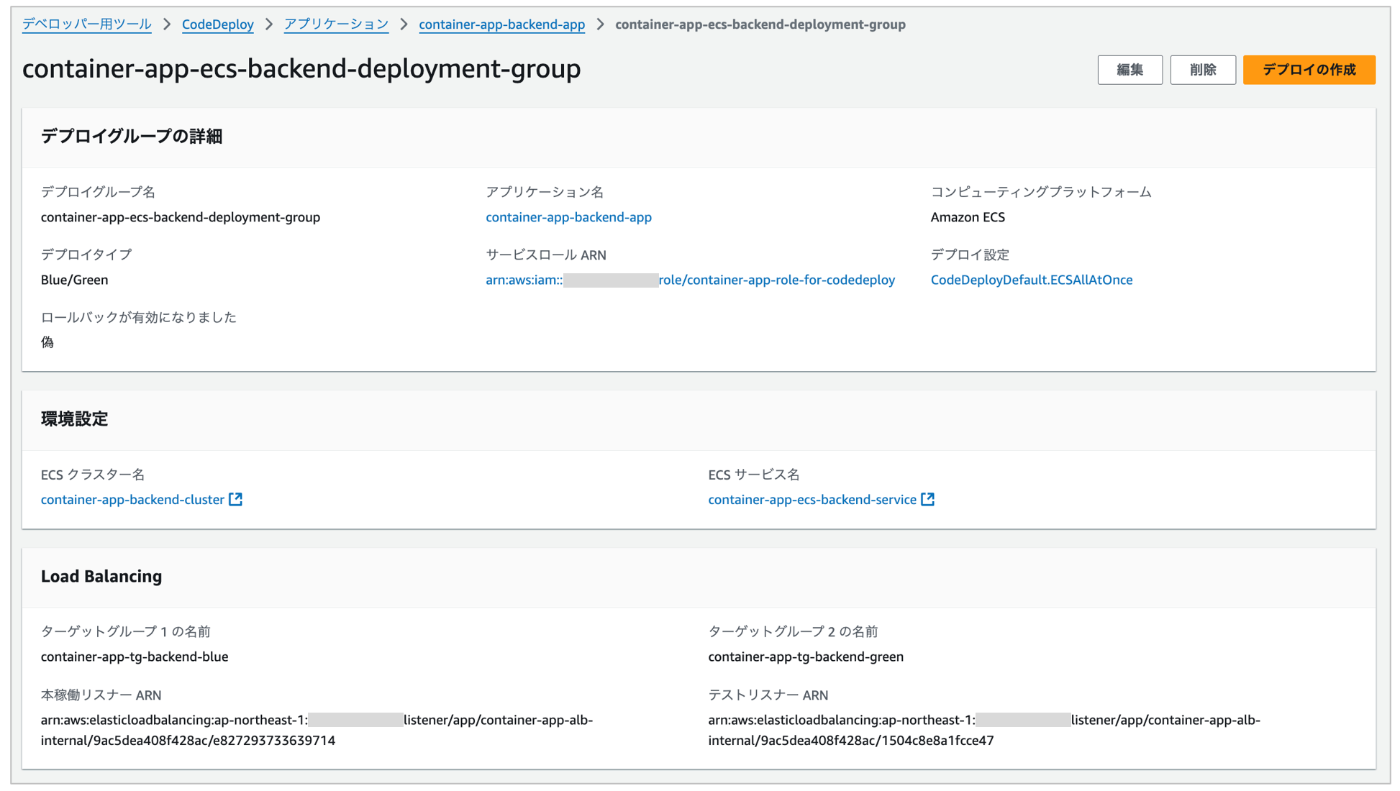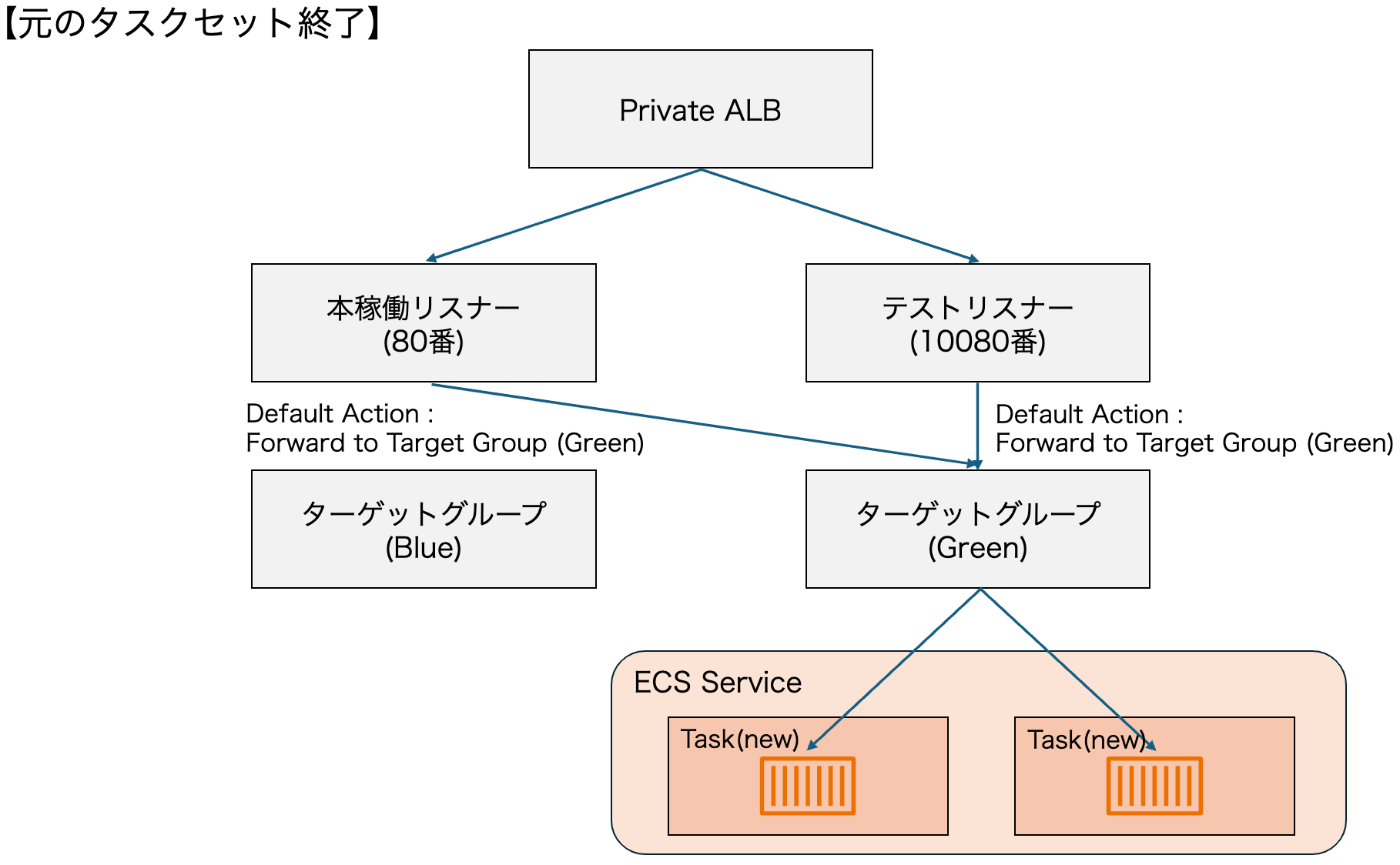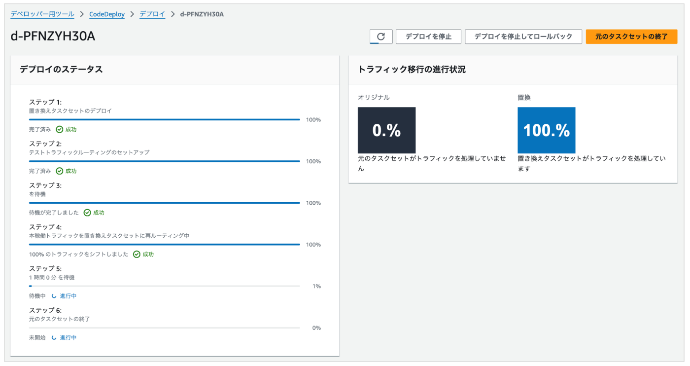 ステップ5において「元のタスクセットの終了」を押下することで、旧ECSタスクを削除し、Code DeployによるB/Gデプロイメントを完了します。