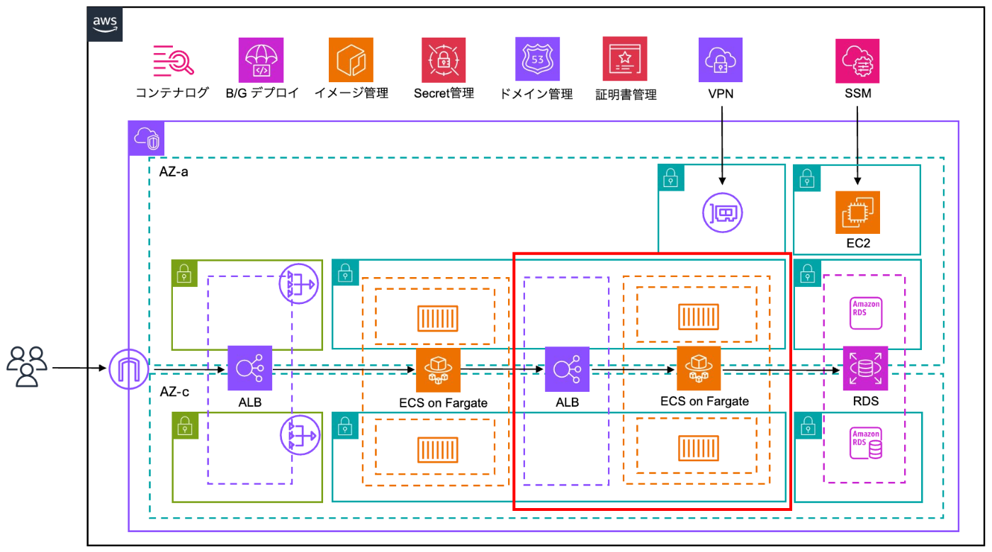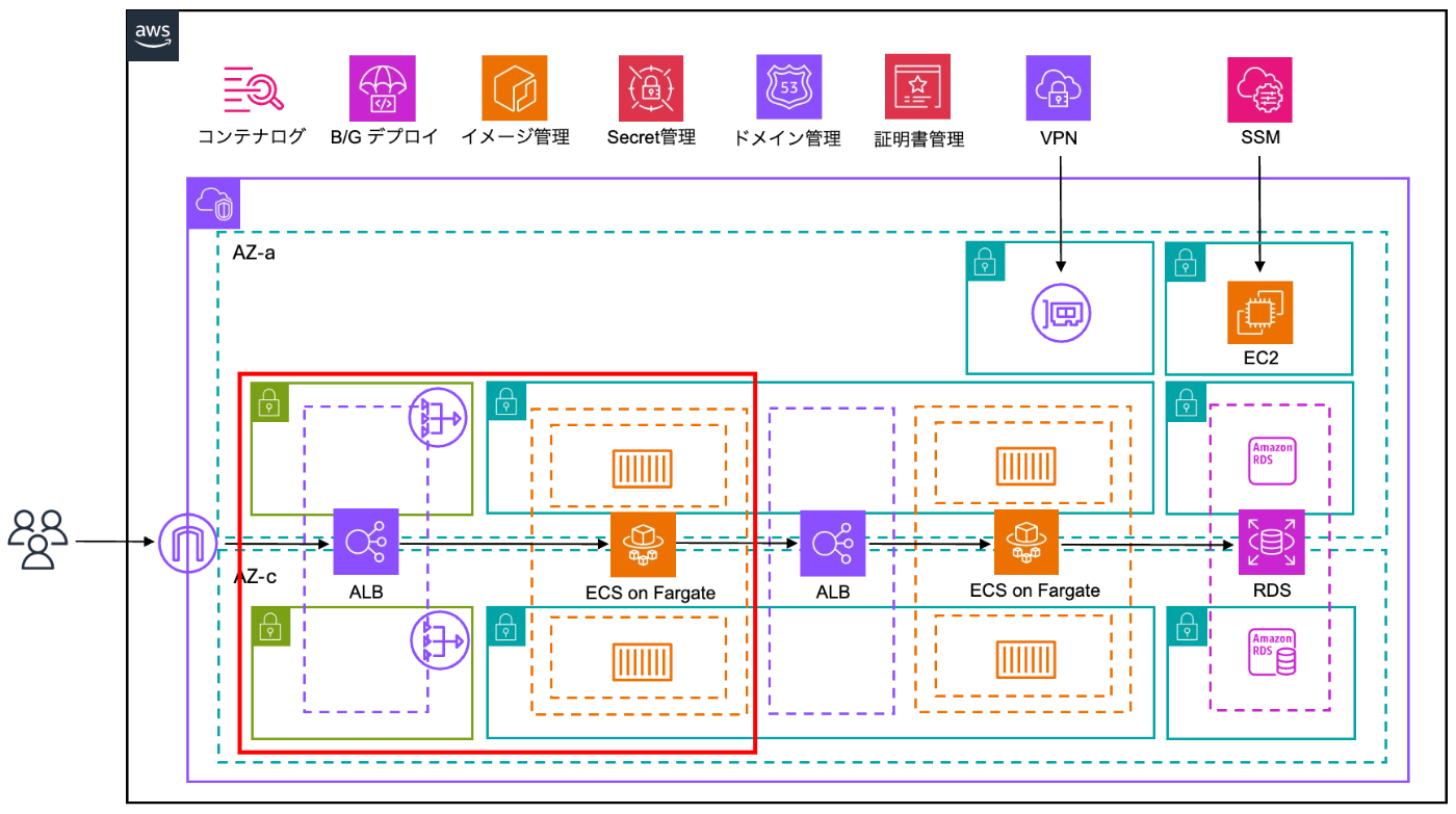 下記構成図の赤枠で囲ったフロントエンド部分から確認していきます。
