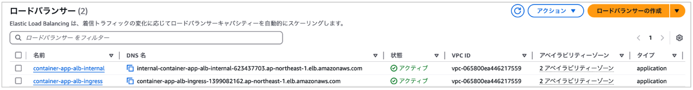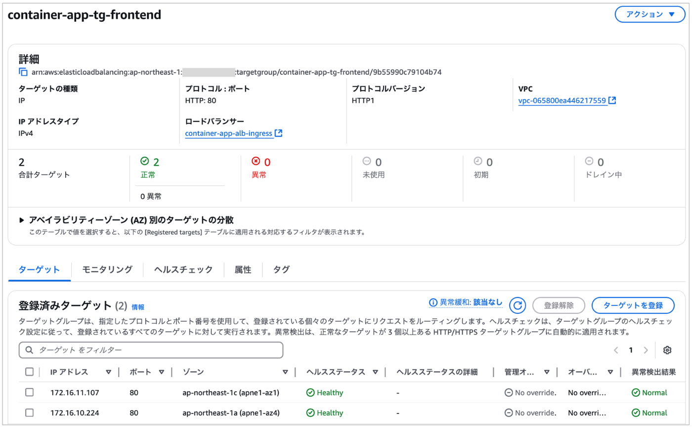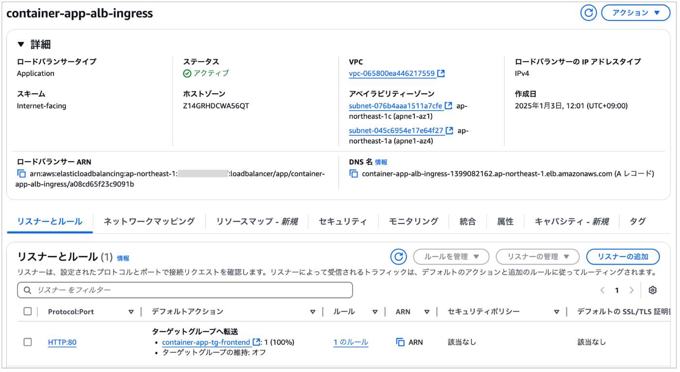 Public ALBは80番の本稼働リスナーを持ち、ターゲットグループに関連付けられたECSコンテナの80番ポートに通信を転送する一般的な構成となっています。ALBを用いてECSコンテナ間で負荷分散するためには、ECS Serviceをターゲットグループに関連付けた上で、通信の転送先であるECSコンテナを指定する必要があります(本関連付けはaws_ecs_serviceにて定義しています)。