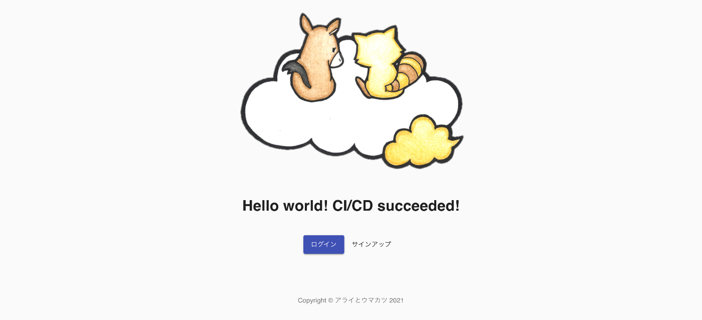 再びフロントエンドアプリケーションのトップページにアクセスすると、Hello world! CI/CD succeeded!という文字列が出力されることを確認できます。以上で、GitHub Actionsを使用したCI/CD実行の動作確認は完了です!