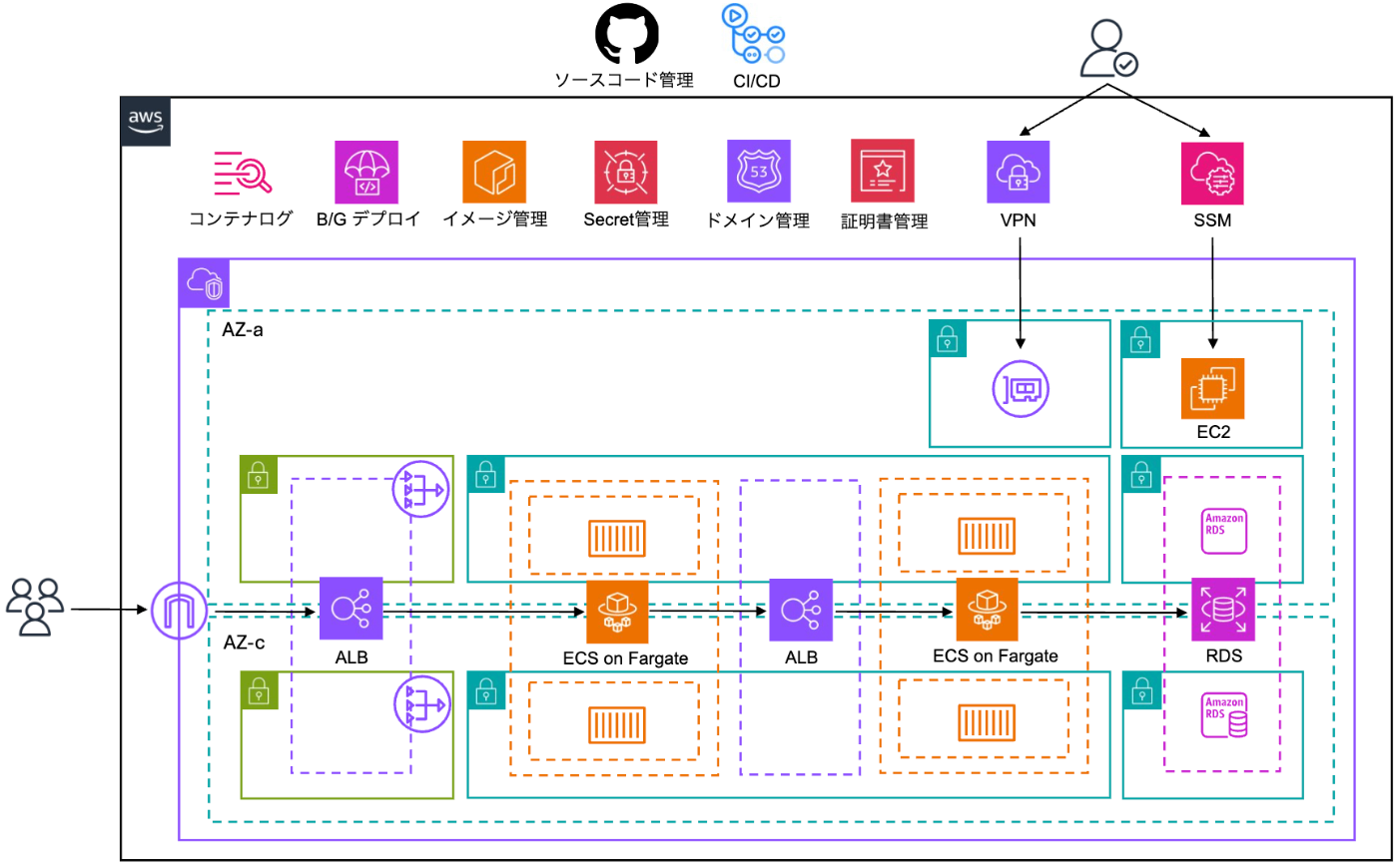 業務でECS on Fargate + GitHub Actionsを使用したコンテナ構築を担当することになった際に読んだAWSコンテナ設計・構築[本格]入門の内容が非常に良かったため、書籍の構成をベースにしたECSコンテナ環境をTerraformで構築し、GitHub Actionsを用いてCI/CDを実装しました。