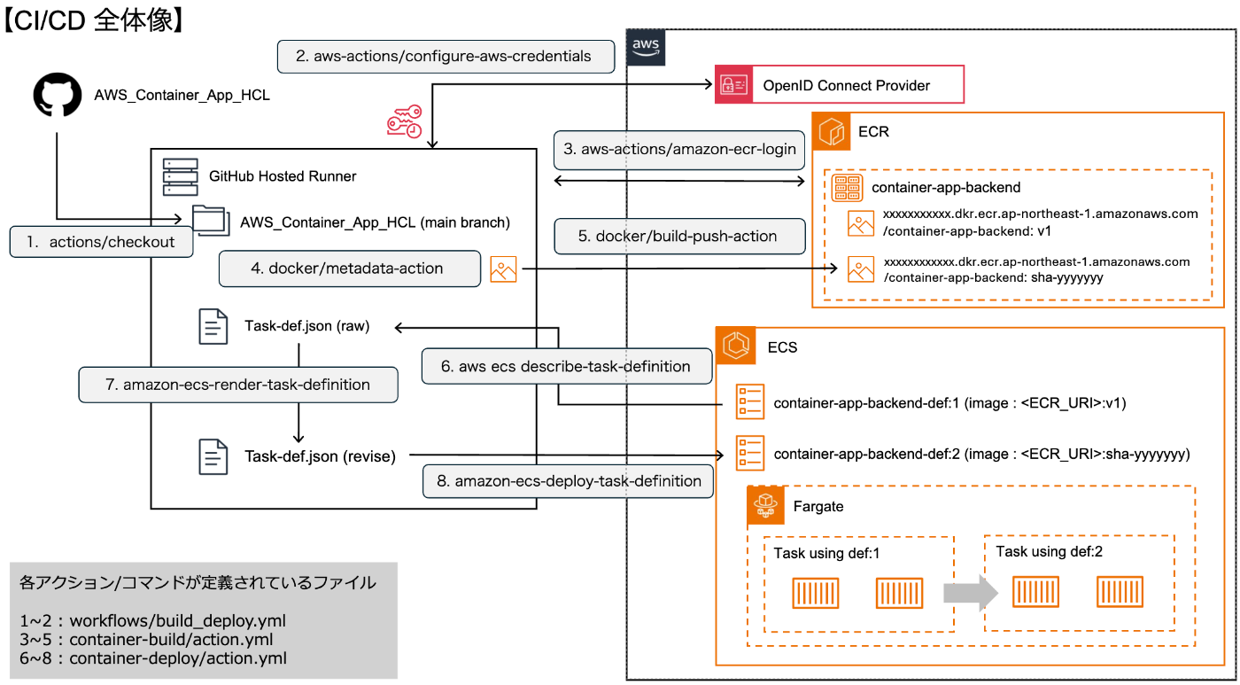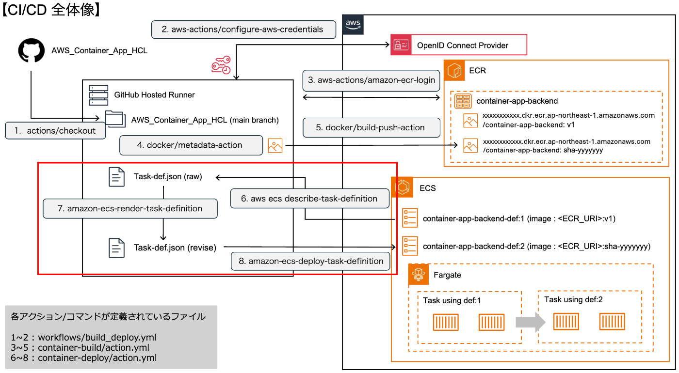 以下の【CI/CD 全体像】において赤枠で囲んだNo.6~No.8のアクションをまとめて定義したアクションである./.github/actions/container-deploy/action.ymlについて各アクションの詳細を確認します。