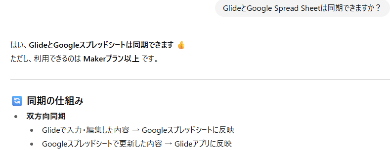 最終、Glideの説明ページをAIに読み込んで翻訳&教えてもらいました↓