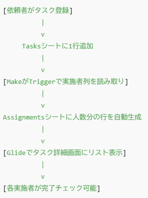 Google Spread Sheet に文字が追加されたことをトリガーとして MAKE でタスク進捗状況シートに追記したものをGlide連携すればできるとのこと・・・ ↓AIによるイメージ
