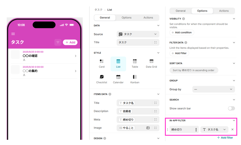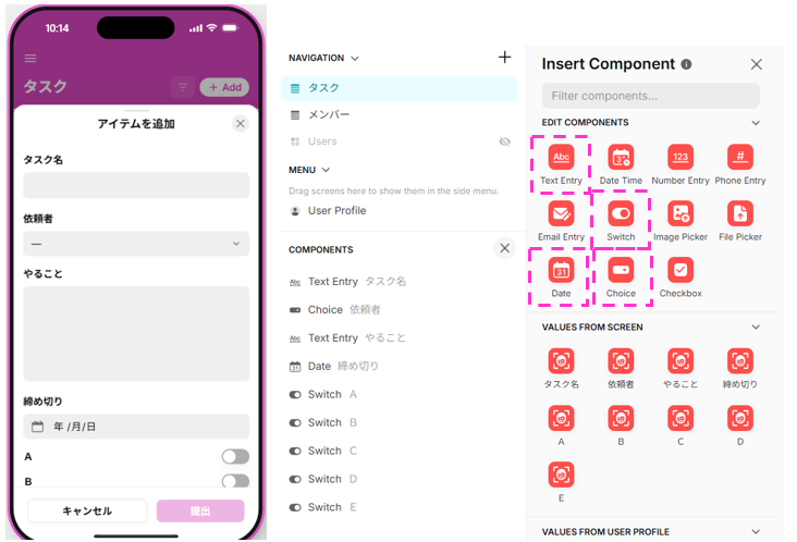 タスクを入力する画面ではコンポーネントを最適なものに設定