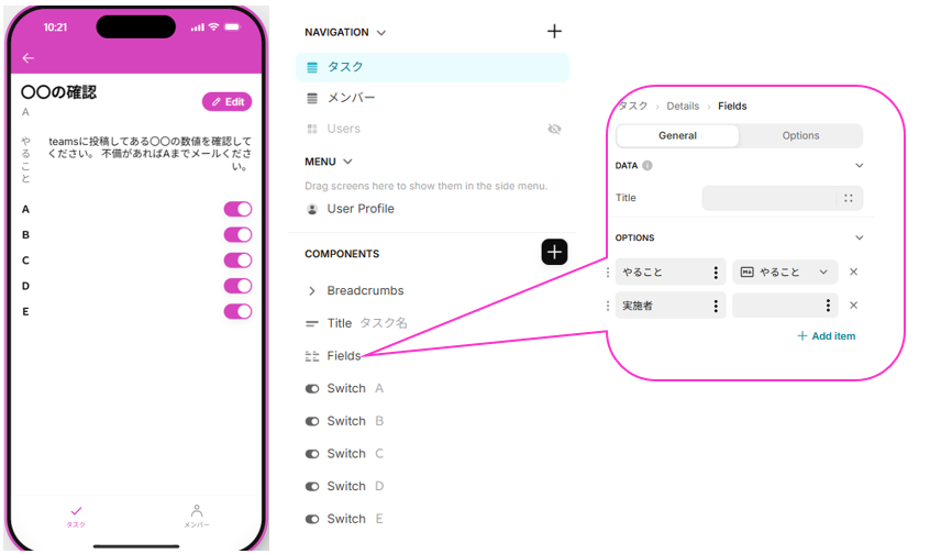 各担当者がタスクを実施したかどうかを設定できるように「Switch」