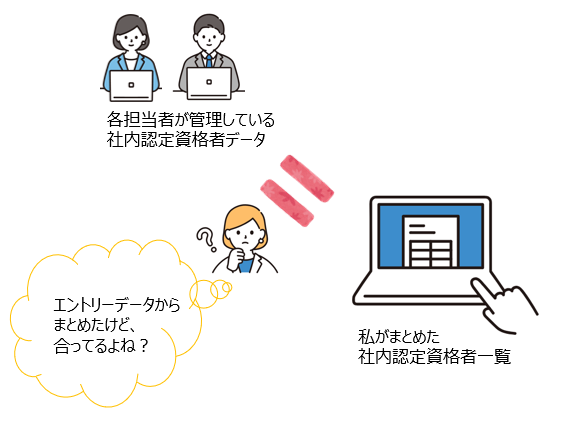 年度当初の育成エントリーデータと合格者をまとめたデータと各担当者が管理しているデータに不備がないかを最終的にチェックしてもらいます。(なぜか漏れていたり、数値があっていなかったりするんですよね・・・