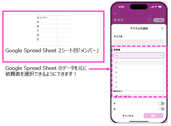 依頼者はメンバーから選びたかったので「Choice」を選択し、Google Spread Sheet から選ぶ