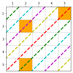 具体的には、$(1,2,\cdots, N)$の順列である$(c_1, c_2,\cdots,c_N)$を作り、$S = \{(c_i, j)| (i-j) \equiv k \mod N, 1 \le i, j \le N, 1\le k \le M \}$を満たすマスを選択する。