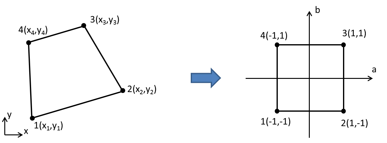 x'y'座標系における要素剛性マトリクス$\boldsymbol{K'_e}$は変数変換とガウス求積を使用して下記のように計算できます。