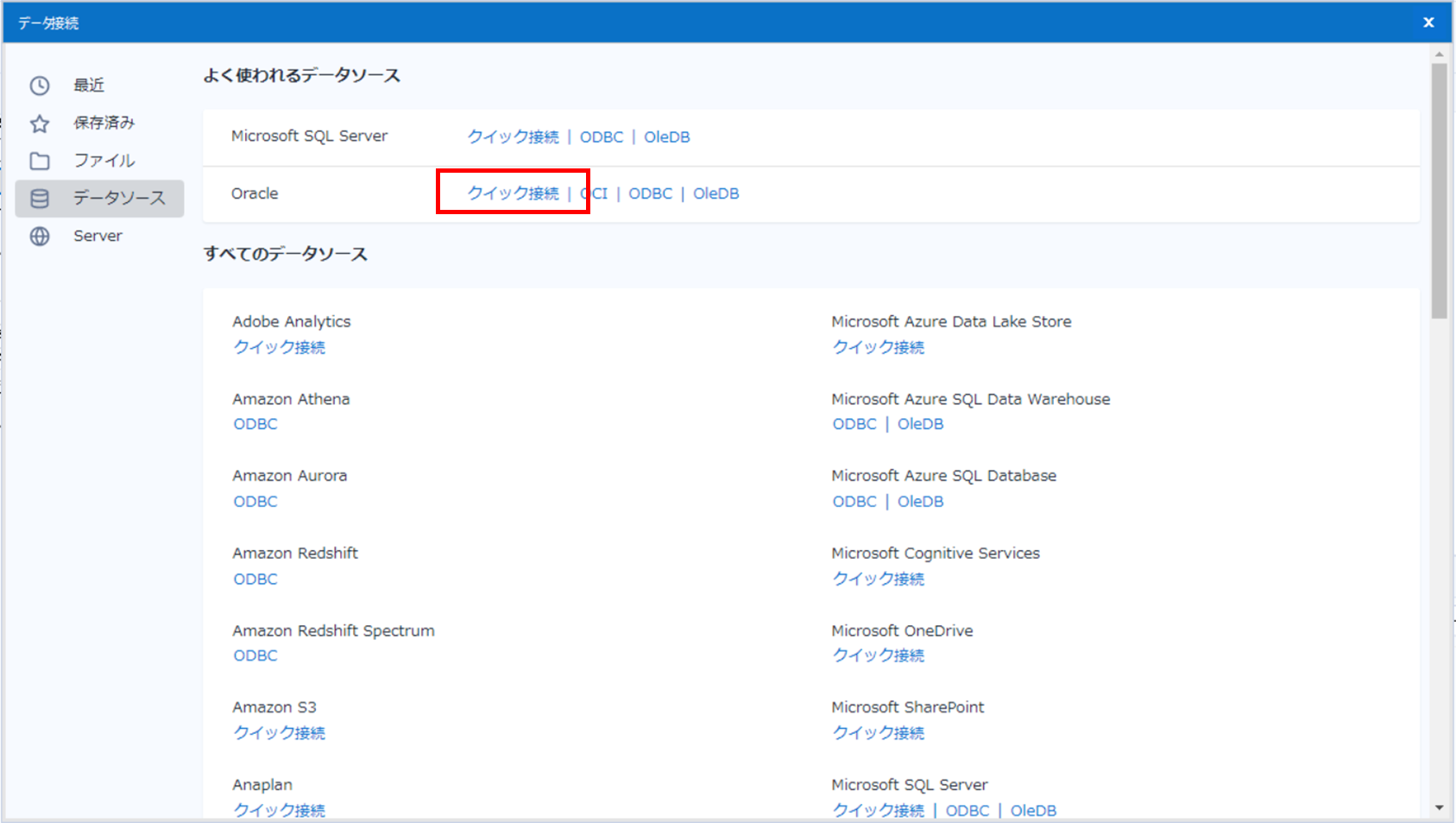 「oracle」セクションの「クイック接続」を選択しましょう。