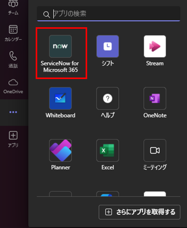 ①「・・・」を押下し、「ServiceNow for Microsoft 365」を押下