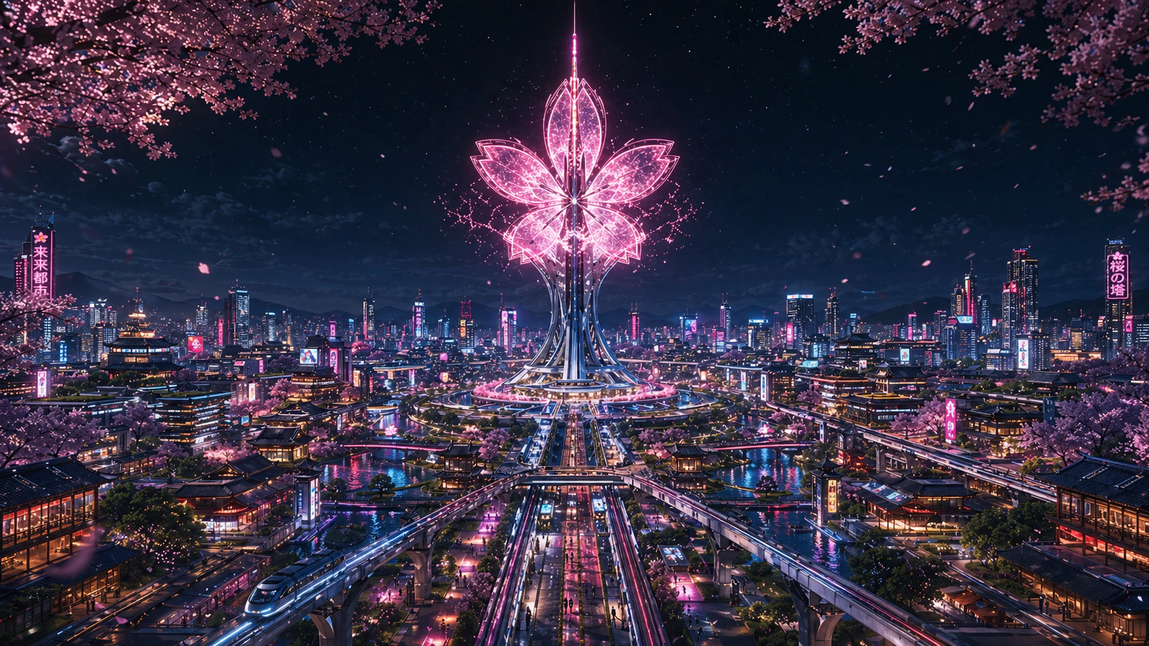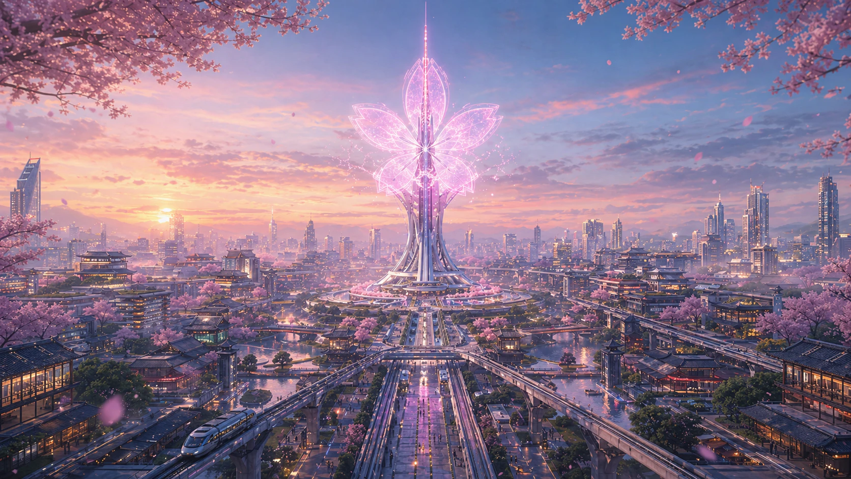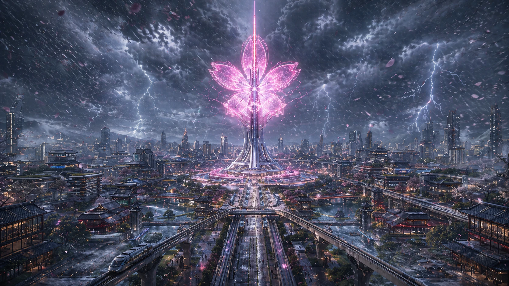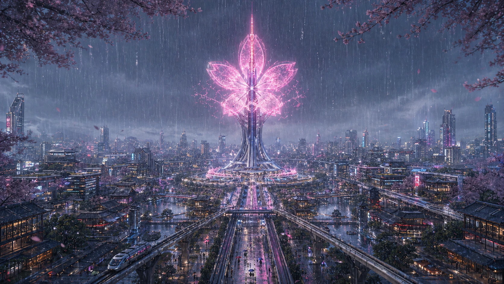 「『日本の四季と近未来都市』をテーマにしたコンセプトアート.春・夏・秋・冬,そして雨・嵐・夜・夜明けの8つの異なるシチュエーションを,同時に8枚生成して.すべての画像で,央に配置された『桜の形のホログラムタワー』のデザインと,都市の基盤となるレイアウトは共通にすること.」