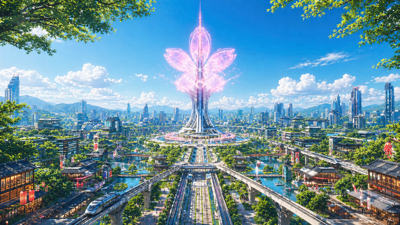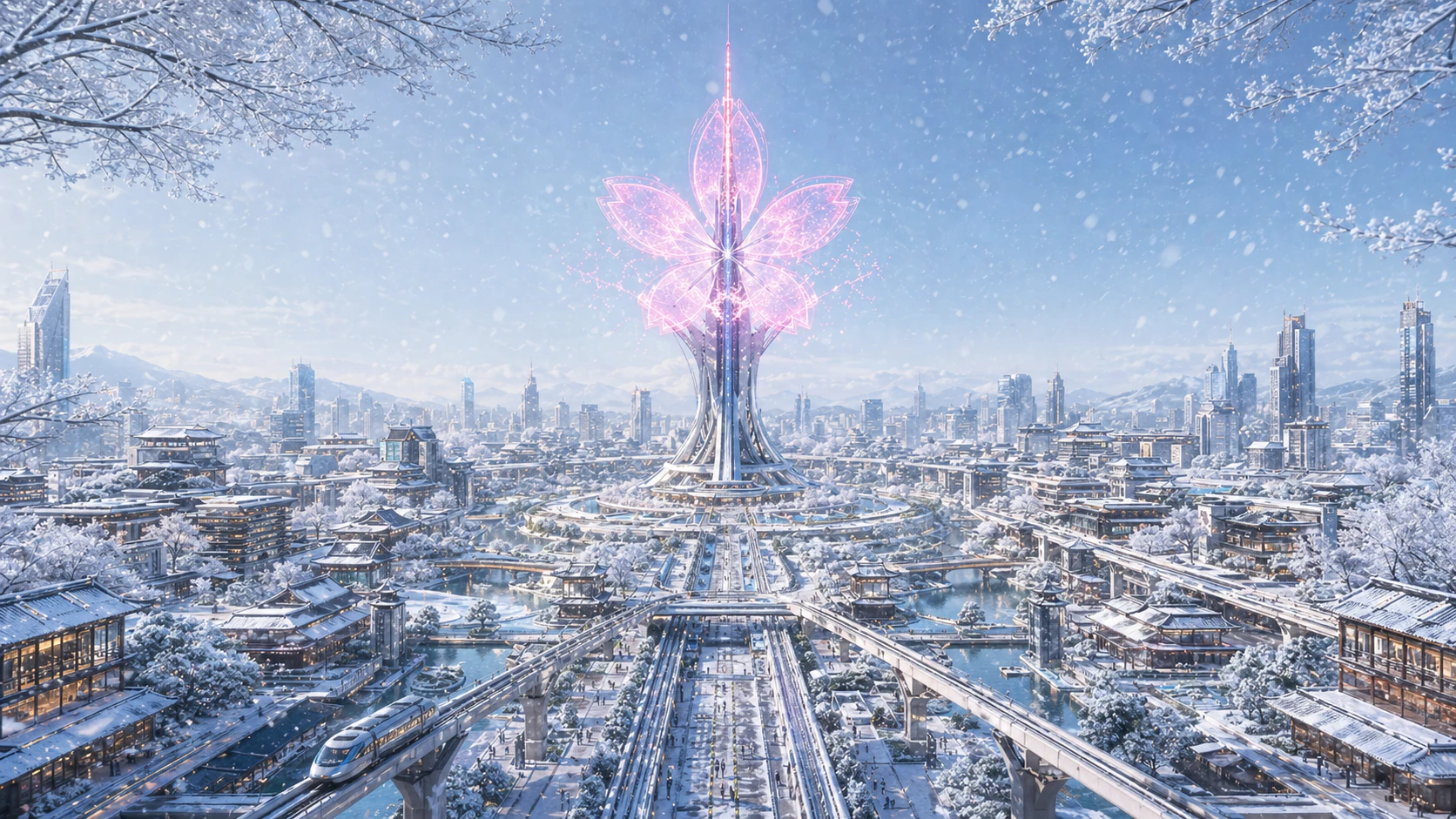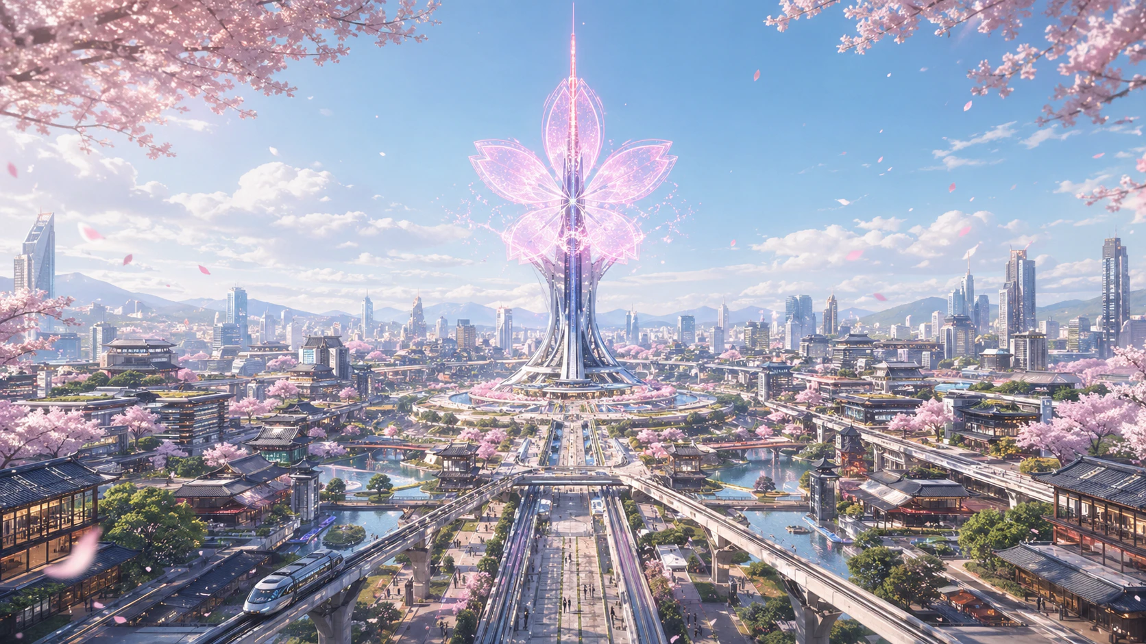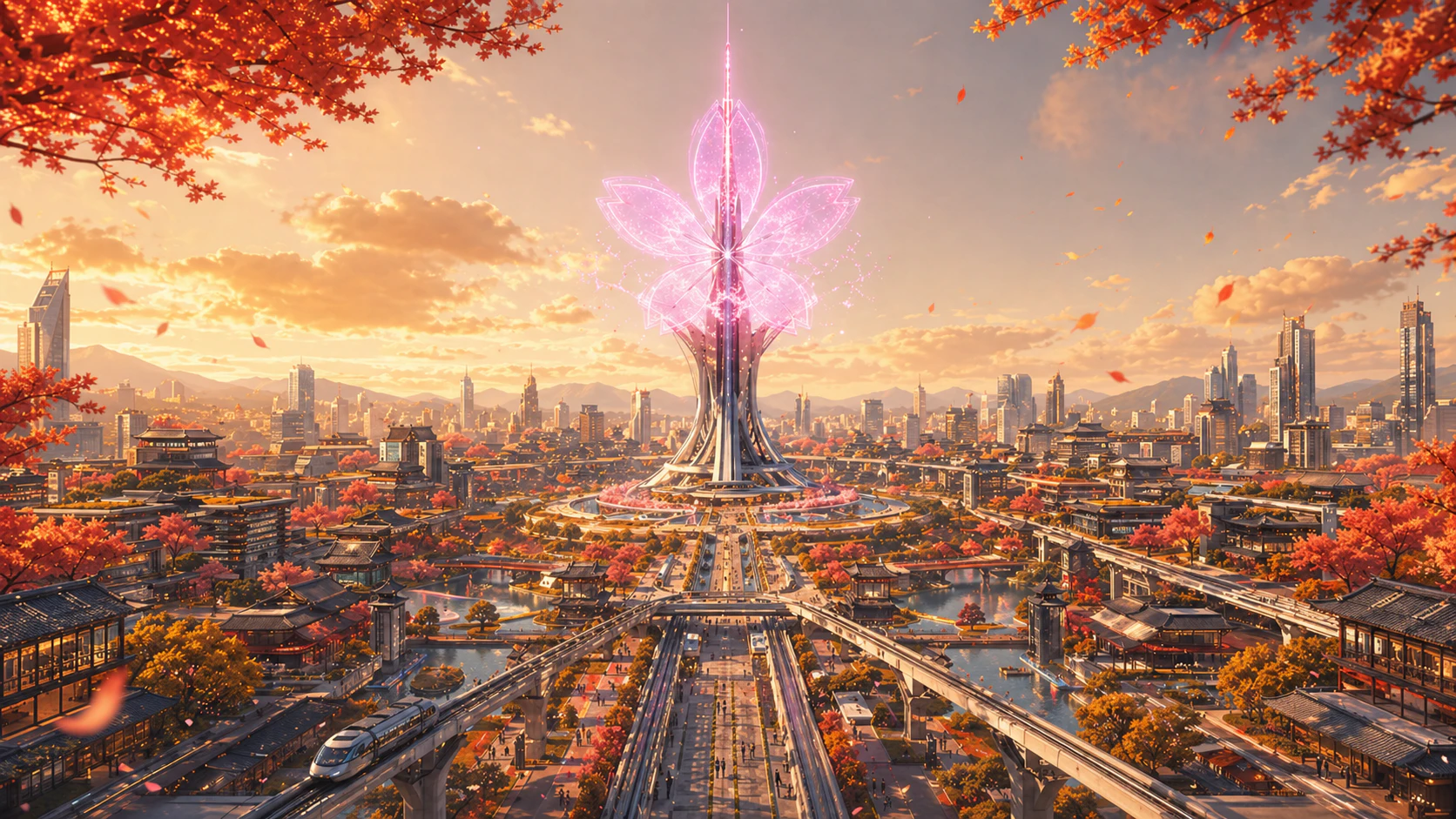 「『日本の四季と近未来都市』をテーマにしたコンセプトアート.春・夏・秋・冬,そして雨・嵐・夜・夜明けの8つの異なるシチュエーションを,同時に8枚生成して.すべての画像で,央に配置された『桜の形のホログラムタワー』のデザインと,都市の基盤となるレイアウトは共通にすること.」